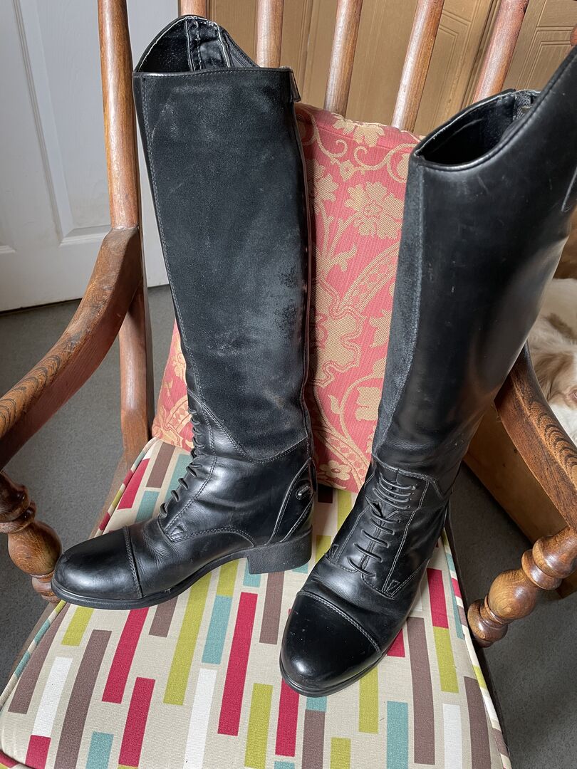 Gut geliebt und wenig benutzt. Das Leder wurde regelmäßig mit Renapur geschützt. Reißverschlüsse und Druckknöpfe alle in sehr gutem Zustand. Ariat Stiefelspanner enthalten. Wurde in der Lagerung, da ich meinen Hut aufgehängt.