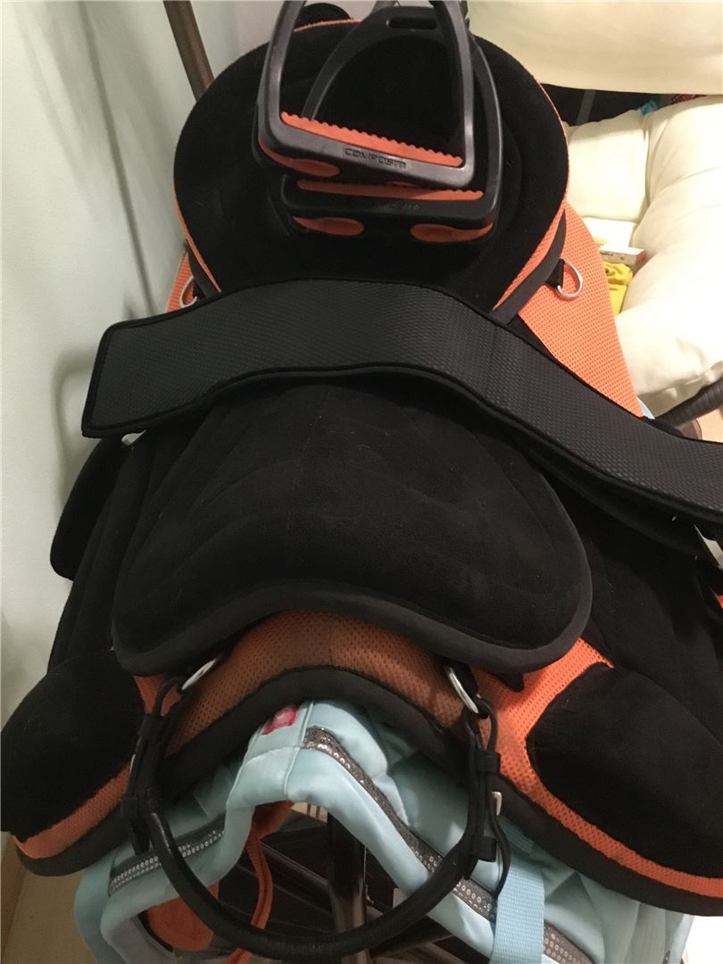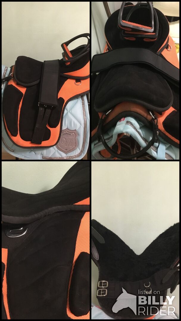 Hallo ihr Lieben, ich verkaufe hier meinen baumlosen Sattel in Orange, den ich fürs einreiben meines Jungpferdes in Gebrauch hatte. Da er mir aber von der Sitzfläche zu groß ist habe ich mir den Gleichen nur kleiner gekauft. Farbe Orange, mit Gurt und Hilfsgriff, sowie mit passenden leichten Steigbügeln. Größe 18“ Länge insgesamt 53 cm Sitzfläche 43cm Bei Fragen meldet euch gerne.