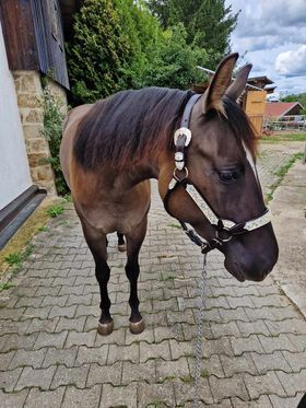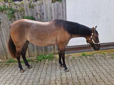 Standort: 93486 Runding Diese bildhübsche Quarter Horse Stute in der tollen Farbe Grullo mit weißen Stichelhaaren sucht ein neues, förderndes Zuhause. My Pretty Valentina ist 2021 geboren und hat ein aktuelles Stockmaß von 155 cm. Sie steht auf einem korrekten Gebäude und ist ausgewogen bemuskelt. Zeigt sehr schöne Gänge. Valentina steht aktuell im Offenstall, kennt aber auch Boxenhaltung. War bisher nie krank. Die Stute besitzt einen ganz lieben Charakter und lässt sich nicht leicht aus der Ruhe bringen. Problemlos beim Hufschmied und fährt brav Anhänger. Valentina geht brav alleine und in der Gruppe an der Hand ins Gelände, kennt das longieren und ein wenig Bodenarbeit. War auch schon mal auswärts zum Halter Training. Ebenso durfte sie schon mal kurz Turnierluft schnuppern und hat dieses ganz souverän gemeistert. Bei der Arbeit zeigt sie sich sehr lernwillig und hat eine schnelle Auffassungsgabe. Die Stute besitzt ein tolles Allround Papier: Enkelin von Mr King Raffles und CX Pretty Boy Hoss. Ihre Vollschwestern werden bereits sehr erfolgreich geshowt: u.a. European Champion Trail in Hand, Futurity Champion Trail in Hand, Futurity Reserve Champion Halter, Futurity Champion Ranch Riding, Futurity Champion Reining, Vize bayrischer Meister Ranch Rail u. v. m. My Pretty Valentine wird später unterm Sattel vielseitig einsetzbar sein und immer ein gutes Bild beim Turnier und auch in der Freizeit abgeben. Sie ist im Premium Tarif Lebensversichert, auch auf Unbrauchbarkeit und eine Premium OP Versicherung liegt ebenfalls vor. Diese könnten bei Bedarf ohne Wartezeit übernommen werden. Von privat abzugeben.
