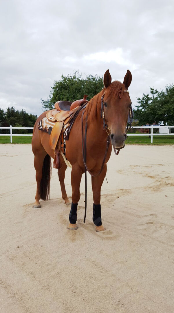Standort: 04509 Krostitz Dieser bildhübsche Quarter Horse Wallach punktet nicht nur durch sein kräftiges Gebäude, sondern auch durch seine erstklassige Abstammung. Mj Sailin The Nite ist ein 2012 geborener Wallach mit einem Stockmaß von 148 cm. Der Wallach ist gesund und absolut unverbraucht, da er die letzten Jahre wegen Zeitmangel nicht viel geritten wurde. Er erhielt eine Westernausbildung durch einen Profi und hat Turniererfahrung in der Reining. Unterm Sattel zeigt er viel Talent. Die letzten Jahre wurde viel Bodenarbeit mit ihm gemacht und wenig geritten. Der Wallach müsse wieder antrainiert werden. Alle Reiningelemente sind aber sofort wieder abrufbar. Der Wallach besitzt einen umgänglichen und unerschrockenen Charakter, ist aber auch sehr selbstbewusst. Aufgrund dessen ist er kein Anfängerpferd. Sailin's Abstammung ist traumhaft. Ein Enkel von Colonels Smokung Gun und Topsail Whiz. Gunners Special Nite ist der Vater vom Wallach. Der Hengst hat eine LTE von 235.000 $ und ist ein 5 Mio. Dollar Sire. Mj Sailin The Nite wäre ein tolles Pferd für einen ambitionierten, erfahrenen Reiter, der gerne aufs Turnier fahren, aber auch mal eine gechillte Runde ins Gelände gehen möchte.