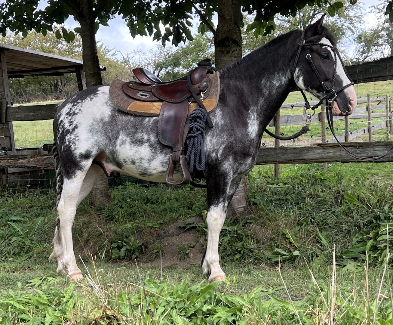 Er steht im Moment 24/7 im Offenstall, kennt aber auch Box mit Paddock.