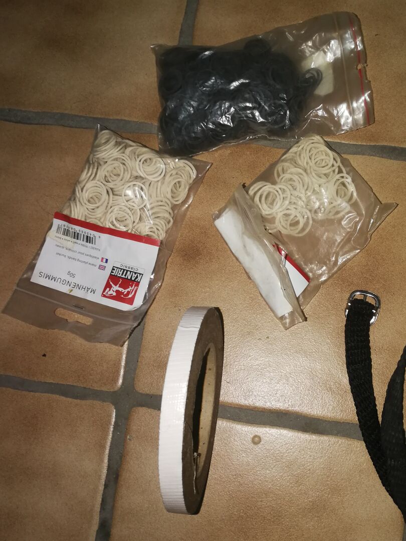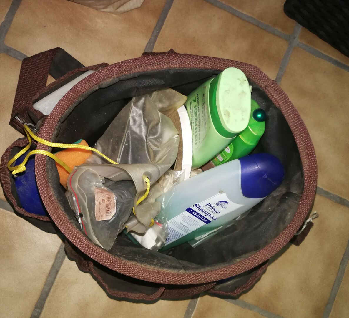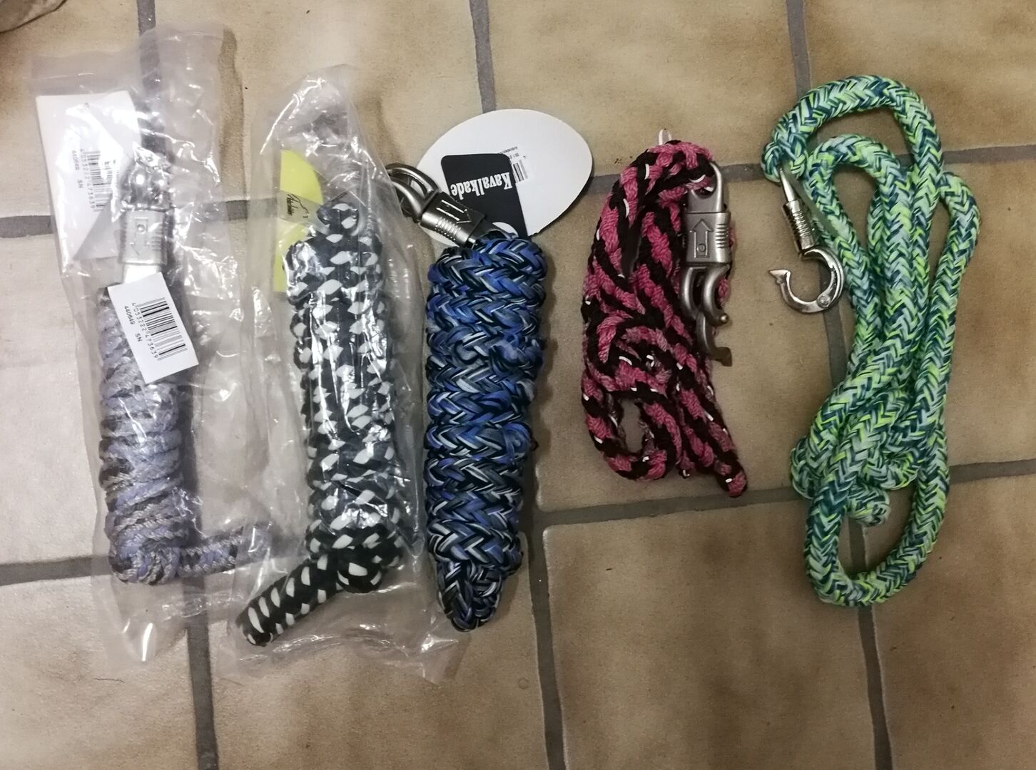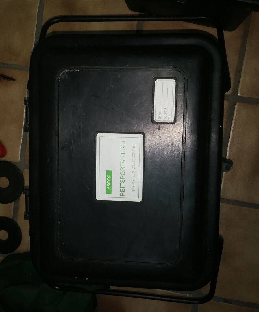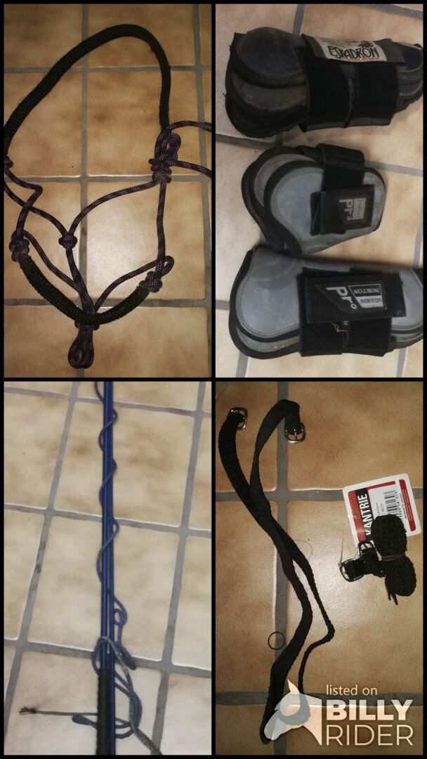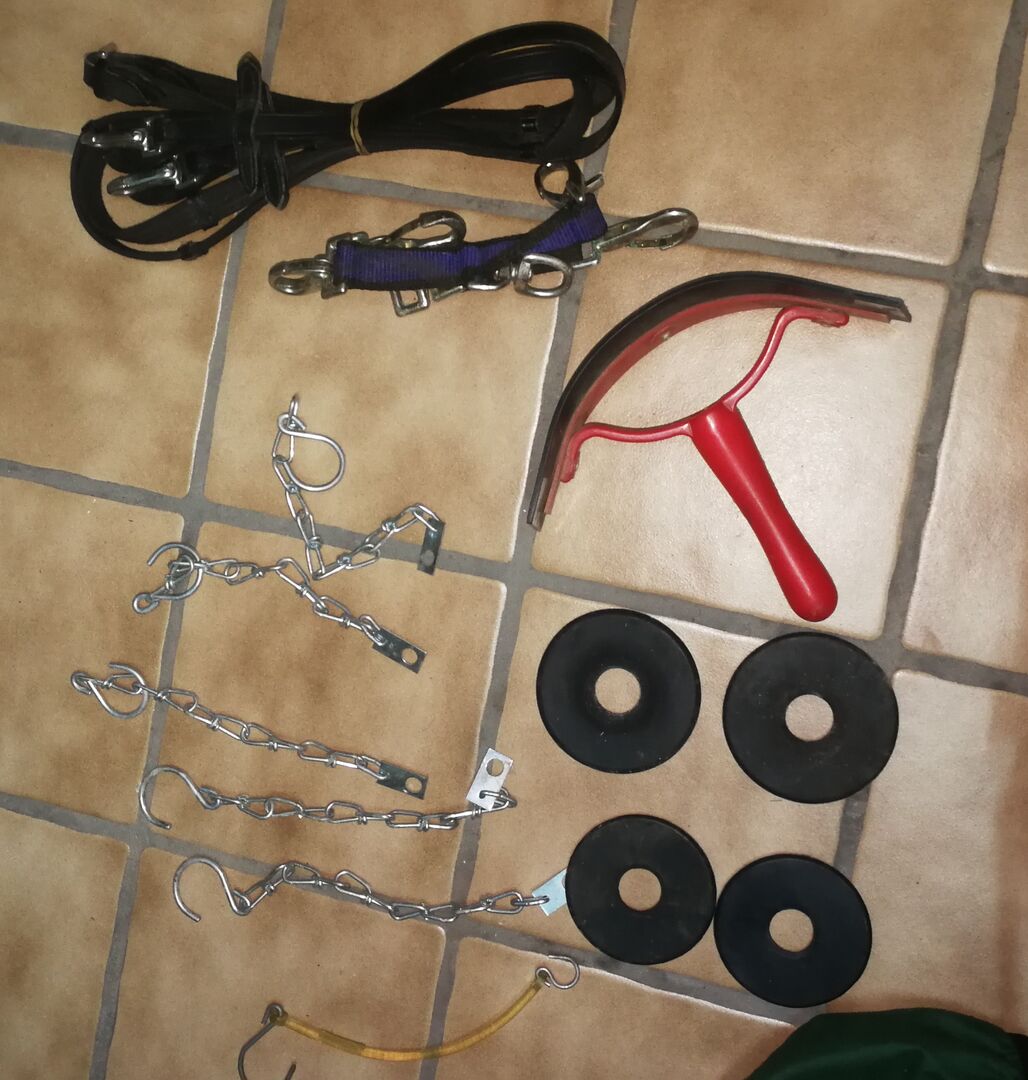 Stricke, Knotenhalfter, Turniernummern Sets, braune Tasche, Kurzgurte 70 cm, 80 cm, Putzkiste, Zügel mit Verschluss zum schnellen ein und Ausgaben des Gebisses, Heunetze usw.