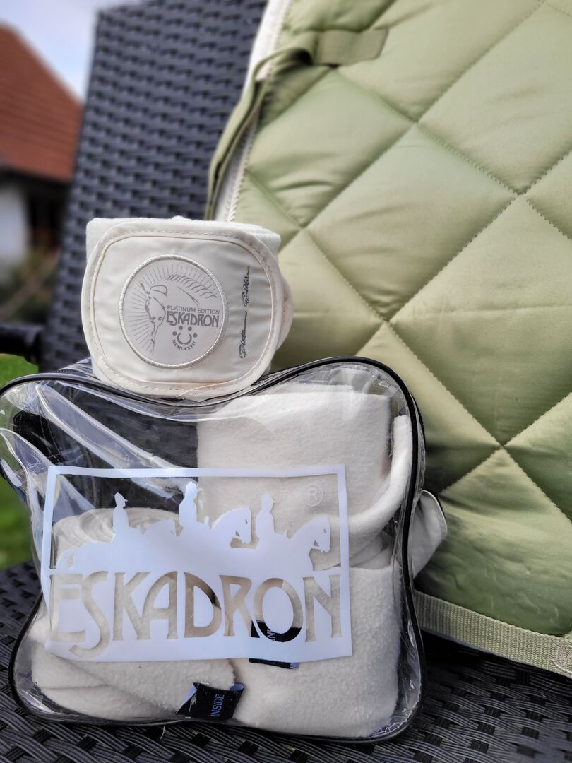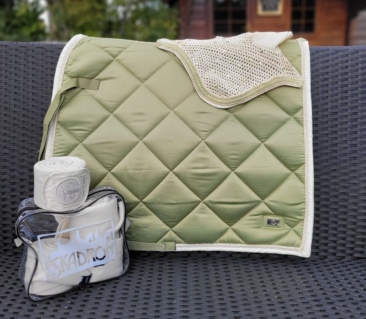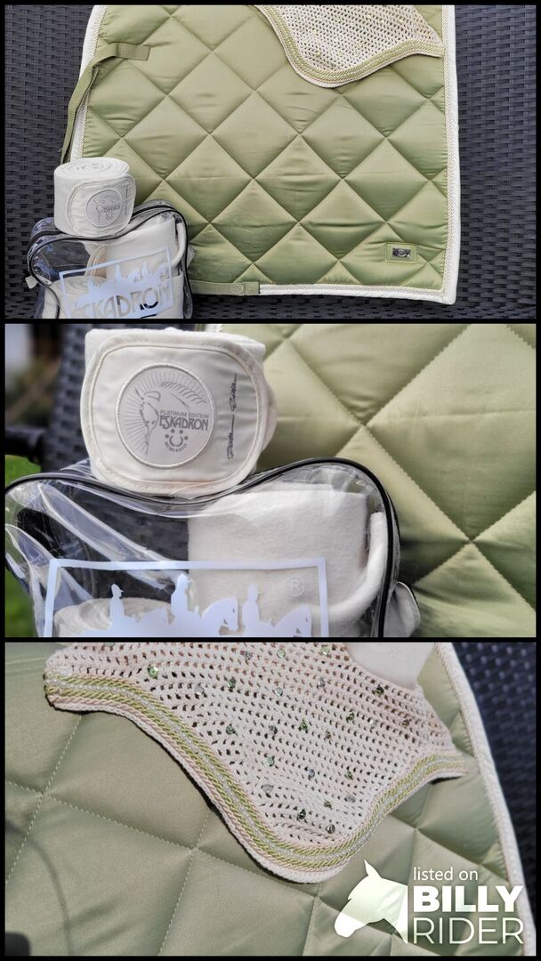 Gebrauchtes Dressur-Set in Mintgrün/Beige. Alles frisch gewaschen. Dabei sind: - RidersChoice-Dressurschabracke: WB / DR - Passende Eskadron-Bandagen: Full - Passende Eskadron-Fliegenohren: Full (wurden selbst benäht)