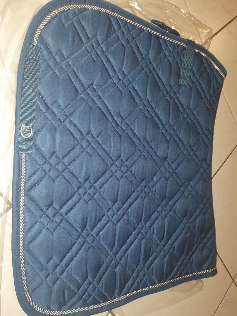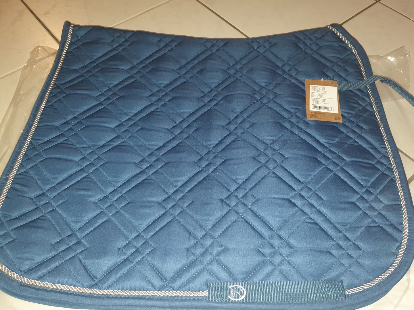 Zum Verkauf biete ich eine neue Dressurschabracke an. Die Farbe heißt moon light blue. Der Rand ist in der gleichen Farbe gehalten. Die Schabracke ist mit einer dezenten hellgrauen Kordel verziert und der Stoff ist hübsch gesteppt.