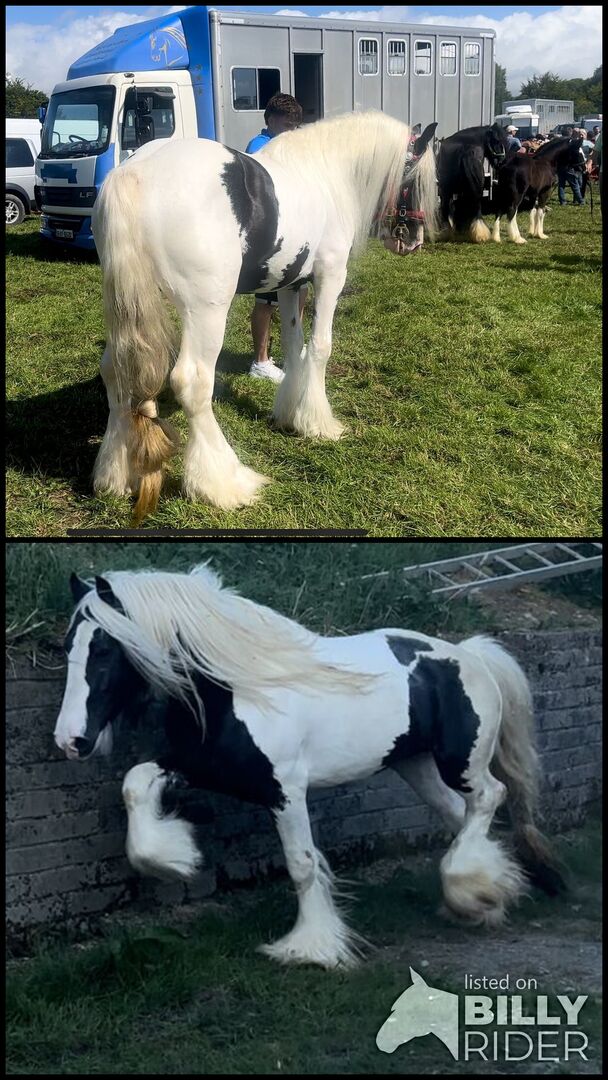 Dieser junge Hengst ist sehr gut gezüchtet aus einem Spitzenhengst und einer der besten Stuten, die ich habe. Sowohl der Vater als auch die Mutter sind irische Eliteschweine mit sehr guten Eigenschaften. Alte irische Blutlinien, richtige große traditionelle Größe starke Zigeunermischlinge. Dieser Typ ist heutzutage sehr schwer zu finden. Erstaunliche Größe und Präsenz, ein wirklich großes Pferd wird erstaunliche große Gypsy Cob Nachkommen produzieren.