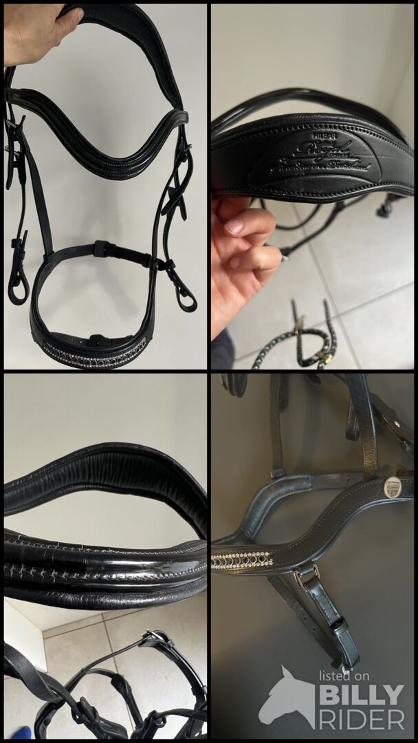 Verkaufe meine inbenutze dieses Jahr auf der Equitana gekaufte englisch kombinierte trense von Hilbar Royal exklusiv. Stirnriemen mit schwarzen Lack, Nasenriemen mit silbern eingefassten schwarzen Steinen und Strasssteinen. Robuste hochwertige Verarbeitung und Verschnallung.