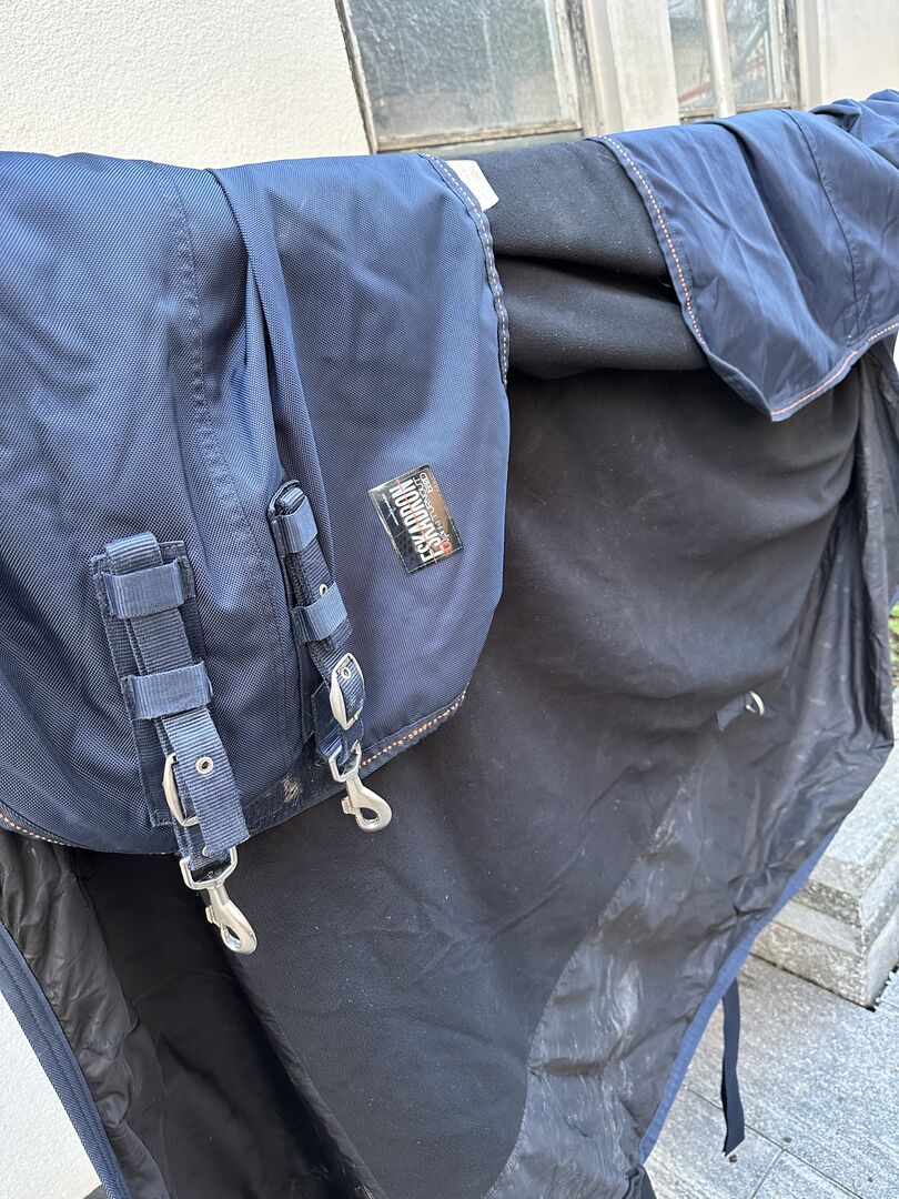 ESKADRON Outdoordecke Beta 80 g besonders strapazierfähig bester Komfort optimierte Passform Die Outdoordecke Beta aus der ESKADRON Kollektion ist eine besonders strapazierfähige Outdoor- und Weidedecke. Bester Komfort und optimale Stabilität bieten das 1680 Denier Polyester-Material, das atmungsaktiv, wasser- und winddicht ist sowie die 80 g Thermofüllung (Wassersäule: 5.000 mm/H2O, Atmungsaktivität: 4.000 g/m²/24h). Die optimierte Passform mit elastischer Neopren-Bewegungszone an den Vorderbeinen verspricht maximale Bewegungsfreiheit. Zusätzlichen Komfort bieten der Mähnenscheuerschutz aus Softneopren und der große Schweifprotektor mit reflektierendem Markenschriftzug. Verstellbare Frontschließen mit separater Brusterweiterung und die Kreuzbegurtung garantieren einen rutschfester Sitz. 80 g Füllung Denier: 1680 Kreuzbegurtung Schweiflatz Material: 100 % Polyester waschbar bis 30°C Wassersäule: 5.000 mm Atmungsaktivität: 4.000 g/m²/24h Nur wenige Male benutzt Größe 155cm