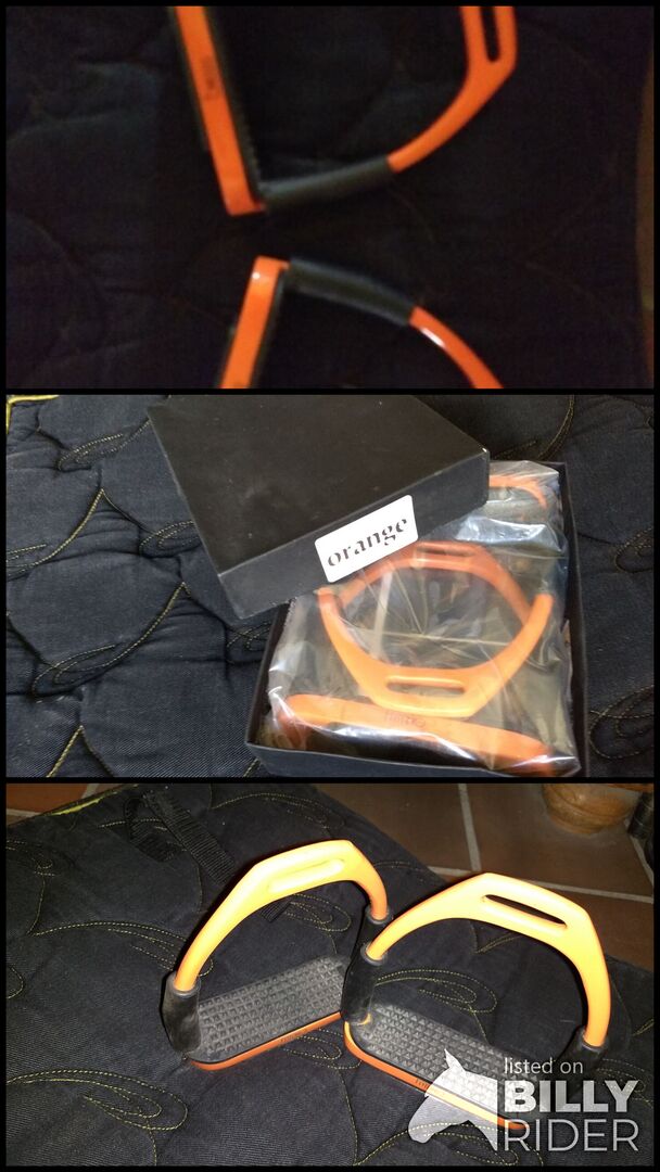 Verkaufe wenig benutzte, daher gut erhaltene, Sicherheits - Steigbügel in Orange Das Fotoit dem dunklen Orange trifft den Farbton recht gut; die anderen Fotos sind leider zu hell geworden.