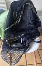 Fliegendecke in dunkelblau mit grün/grauer Borte. Größe 135 cm. Lag auf einem Andalusier.