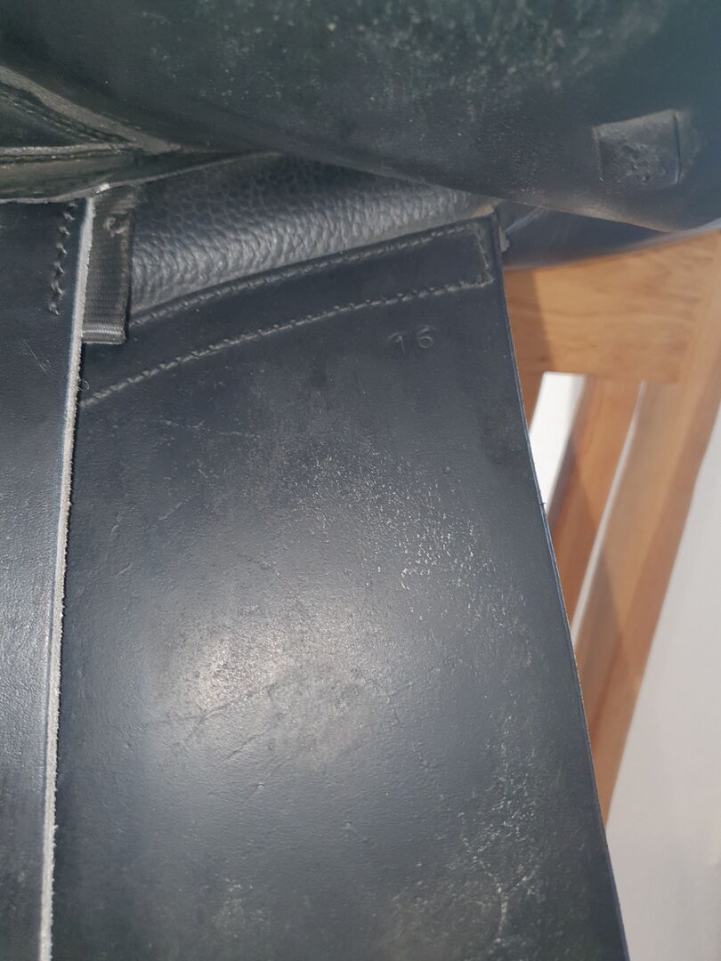 Es ist ein englischer Windsor Sattel, Walsall, Springtree und hat 16 Zoll. Die Kammerweite ist vermutlich etwa 32cm.