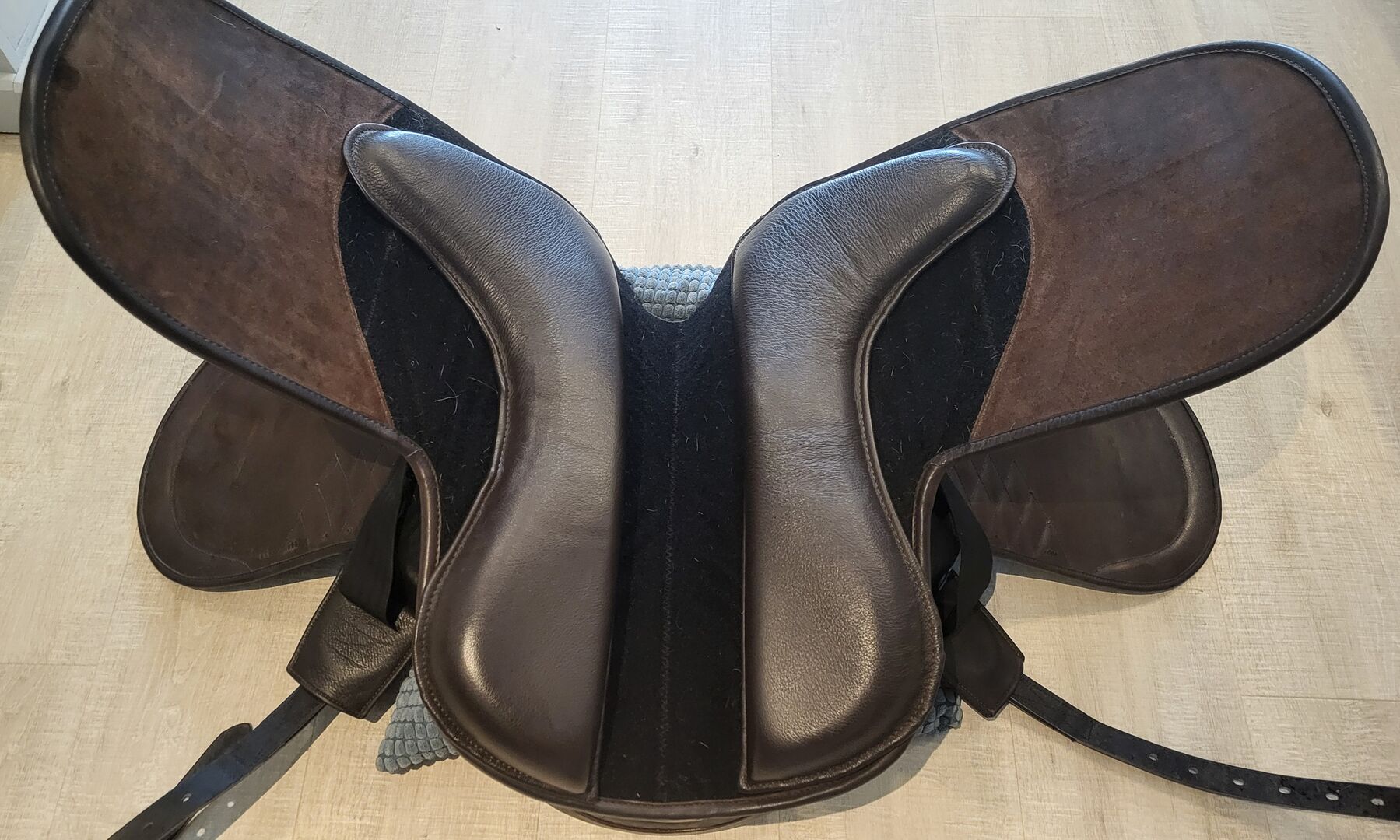Sold with original saddle cover, and 2 sets of velcro blocks, the original ones being a little big, I added smaller ones. Für den Reiter hat dieser Sattel keinen sehr tiefen Sitz, der viel Bewegungsfreiheit bietet und einen engen Kontakt mit dem Pferd ermöglicht. Die wiederverwendbaren Klettverschlüsse sind 4 cm dick und 46 cm lang, wodurch sie sich auch für Pferde mit kurzem Rücken eignen.