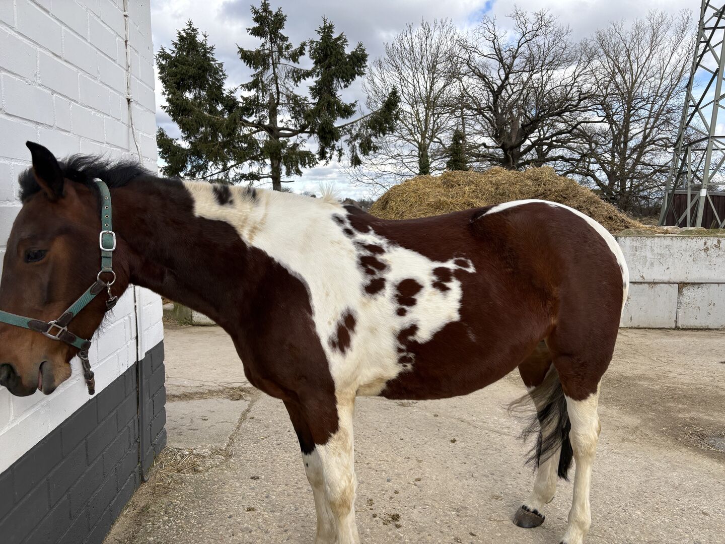 Mit ihrem markanten braun-weißen Fell und einem kompakten Stockmaß von ca. 1,50 m ist sie nicht nur optisch ein Blickfang, sondern bringt auch viel Potenzial für den Einsatz im Dressur- und Freizeitbereich mit.