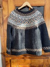 Der Pullover ist mit Istex Lettlopiwolle handgestrickt und hat ein besonders ausgefallenes Muster. Er hat die Größe S/M.