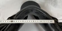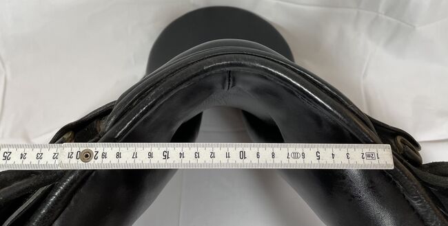 Der Sattel ist gepflegt und in einem sehr guten Zustand. Das Sattelblatt ist an den Pauschen mit Wildleder überzogen, sehr viele Teile sind aus einem sehr grobnarbigen Leder. Die Gurtstrippen sind absolut intakt, die Kammerweite kann ich nicht genau bestimmen, ob diese verändert werden kann, kann ich auch nicht beantworten.