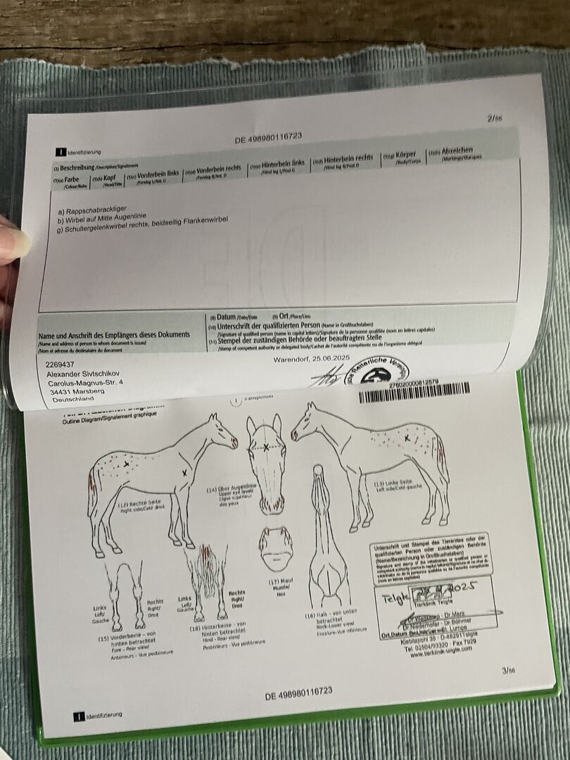 Gesundheit & Pflege: Gechippt, Papiere wurden aktuell beantragt Regelmäßige Betreuung durch die Huforthopädin (alle 4 Wochen) Ekzemfrei & Rehefrei, kennt Verladen und fährt problemlos im Hänger War in der Tierklinik wegen zu langer Bänder am Knie: → Die Bänder wurden gezielt angespritzt, zusätzlich trug er für ca. 3 Wochen eine Erhöhung unter dem Huf hinten, um das Knie in der richtigen Position zu halten. → Nach ca. 4 Wochen war er vollständig beschwerdefrei und ist heute uneingeschränkt belastbar Der zweite Hoden ist noch nicht abgestiegen – laut Tierklinik ist das bis zum 4. Lebensjahr unbedenklich, sofern der Hengst gut händelbar ist – und das ist Sandro absolut