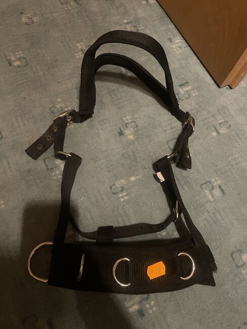 Zum Verkauf steht ein wenig genutzter Kappzaum aus Stoff?, der an der Nase und im Nacken nochmal abgepoöstert ist. Die Größe ist Warmblut und sowohl an der Nase als auch an der ganasche nochmal verstellbar.