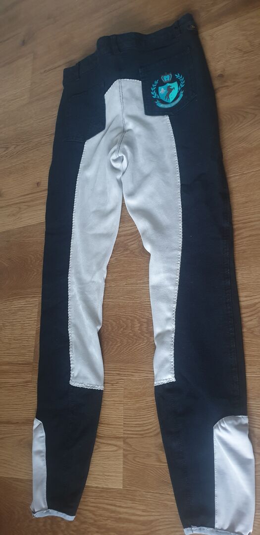 Kinder Reithose in schwarz mit hellbraun Applikationen und einem türkisem Logo auf der rechten Gesäßtasche, Größe 146/152, Versandkosten 5,00€