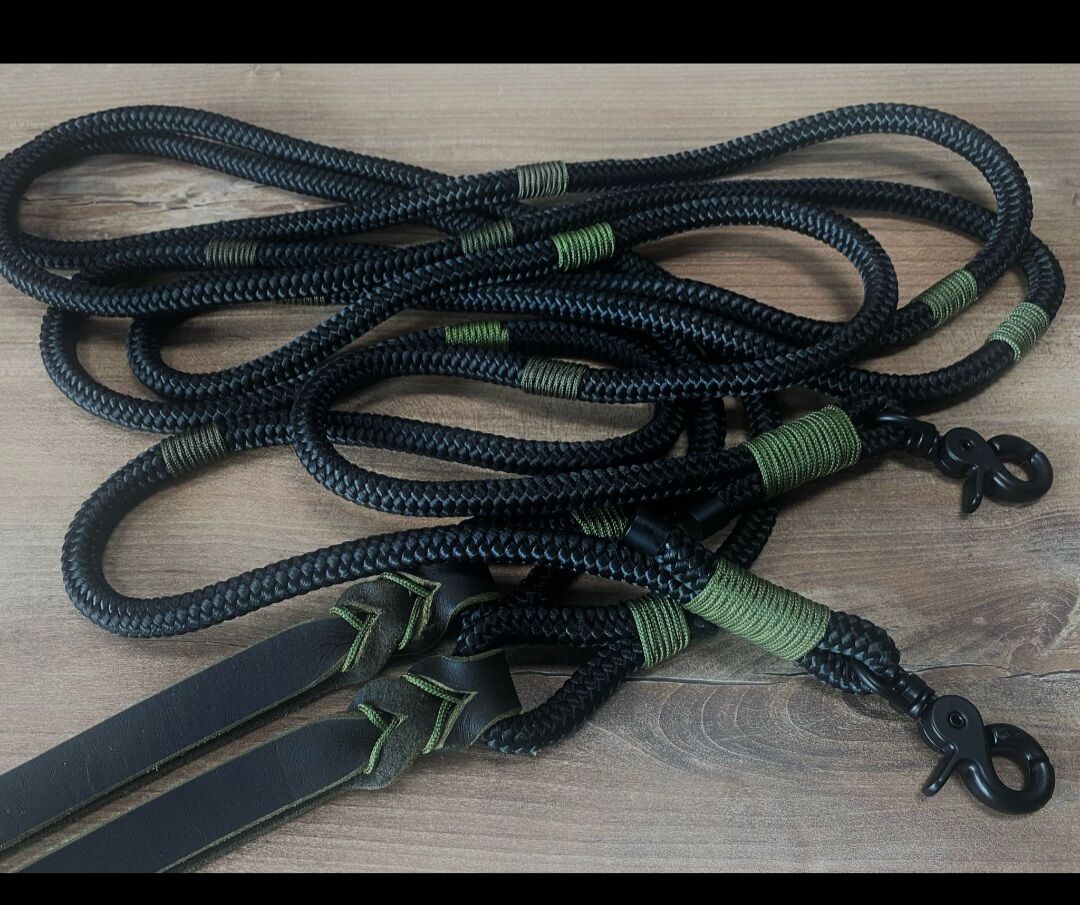 Sehr schickes Knotenhalfter Black, kombiniert mit Black/Green Pepper/Olive mit Zügelringen - zum reiten geeignet. Handgefertigt von Colorful Pearl mit passenden Westernzügeln (offen), Länge 2,20 m in Black 10 mm Seilstärke mit Farbakzenten und Lederpatscherl Neupreis Knotenhalfter - 95,00 € Neupreis Zügel - 62,00 € Angebotspreis zusammen - 90,00 € Kann auch einzeln erworben werden.