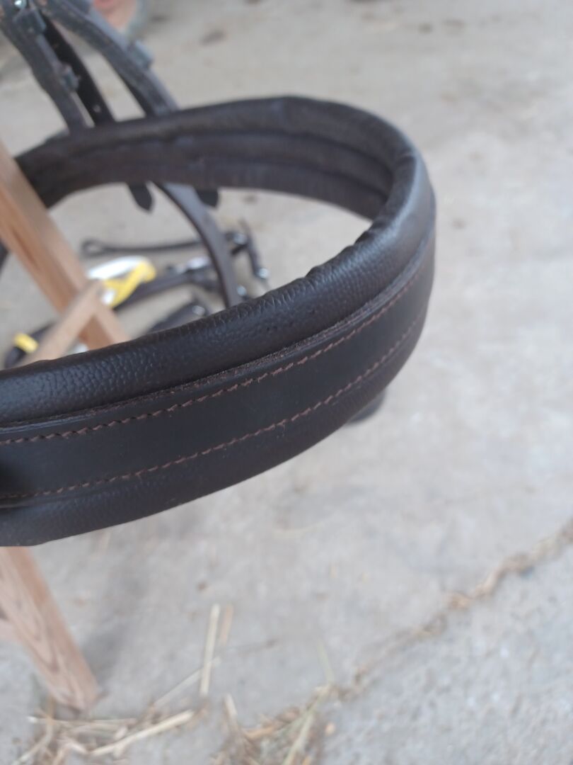 Ich biete hier ein komplettes Einspännergeschirr aus Leder in braun für Shettys an. Brustblatt mit Zugsträngen Selett mit Schweifriemen Hintergeschirr Fahrzaum Leinen