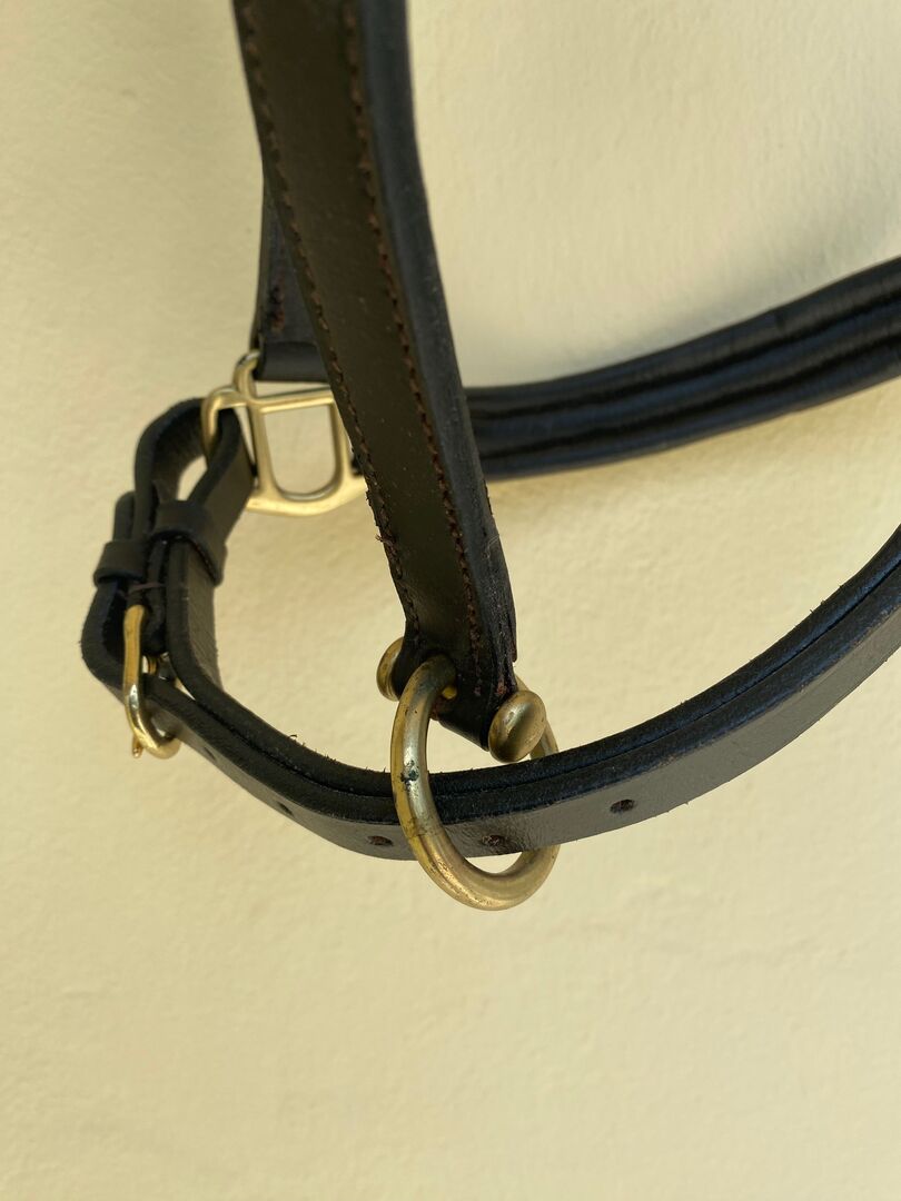 Schönes Lederhalfter mit bernsteinfarbenen Glitzersteinen (alle noch vorhanden) in der Größe COB. Nur wenige Male benutzt, da es meinem Pferd leider nicht passt. Lag lange im Stall. Zustand siehe Bilder.