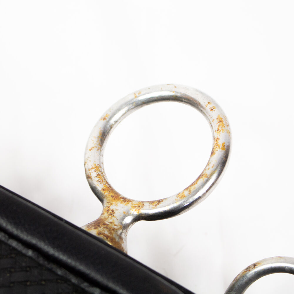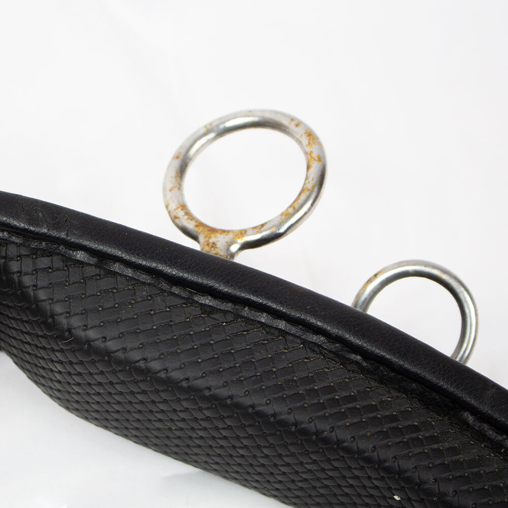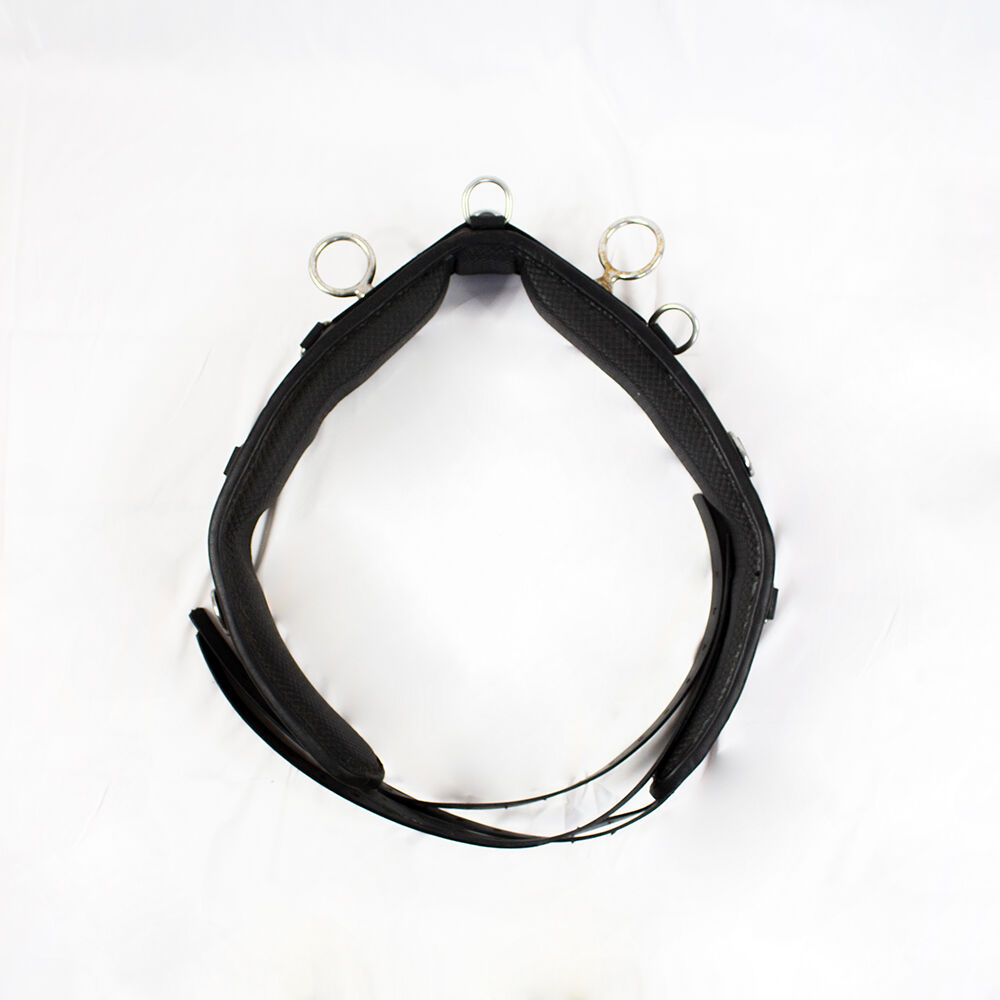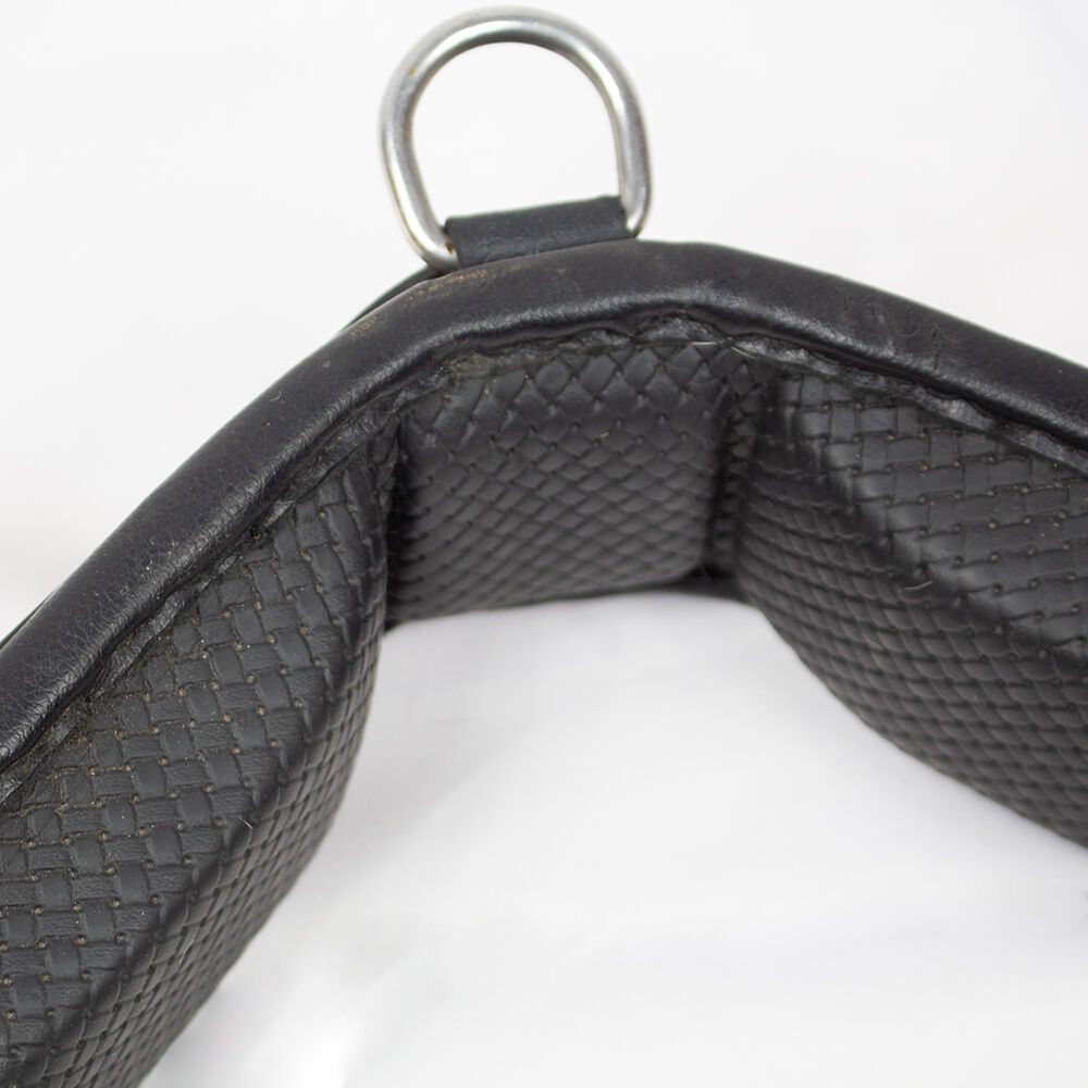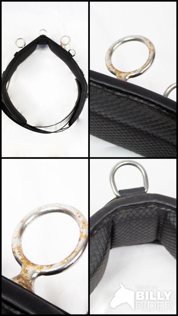 Dieser Longiergurt aus Leder in schwarz der optimale Begleiter im Alltag. Er eignet sich sowohl zum klassischen Longieren, kann aber auch mit der Doppellonge verwendet werden. Durch die vielen silbernen Beschläge können Hilfszügel ganz einfach und individuell eingespannt werden. Der Longiergurt kommt ohne Gurt zur Befestigung. Es wird nur das Oberteil geliefert. Er hat Größe VB und passt auf kleinere Pferde sowie Ponys. Der Gurt hat Gebrauchspuren und Flugrost an den Metallbeschlägen.