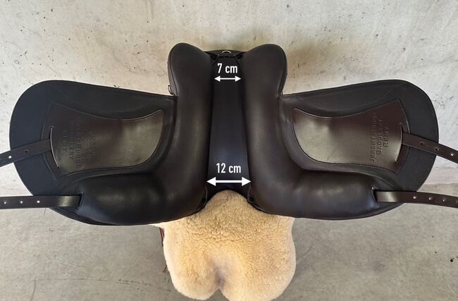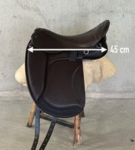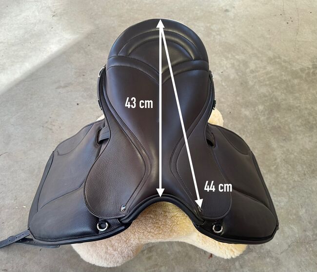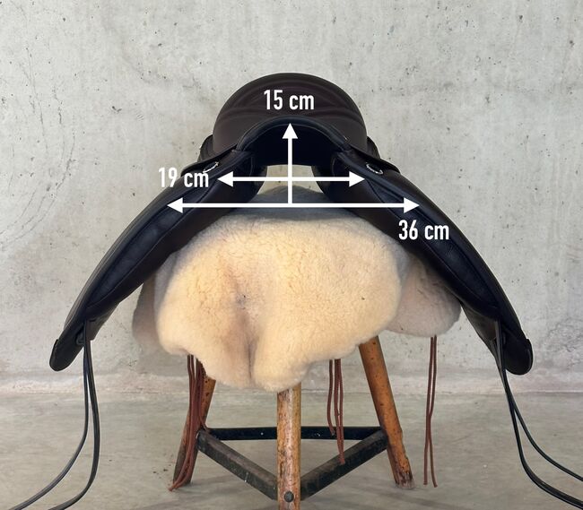 Luxus Freizeitsattel für kurze, sehr kräftig gebaute Pferde mit wenig bis mittelmäßig Widerrist — 17,5" — Auflagefläche ca. 42 cm, Gesamtlänge 45 cm, Kammweite 36, breiter Wirbelkanal (Maße siehe Fotos). Versand auf Probe (versichert mit DHL-Sendungsverfolgung)