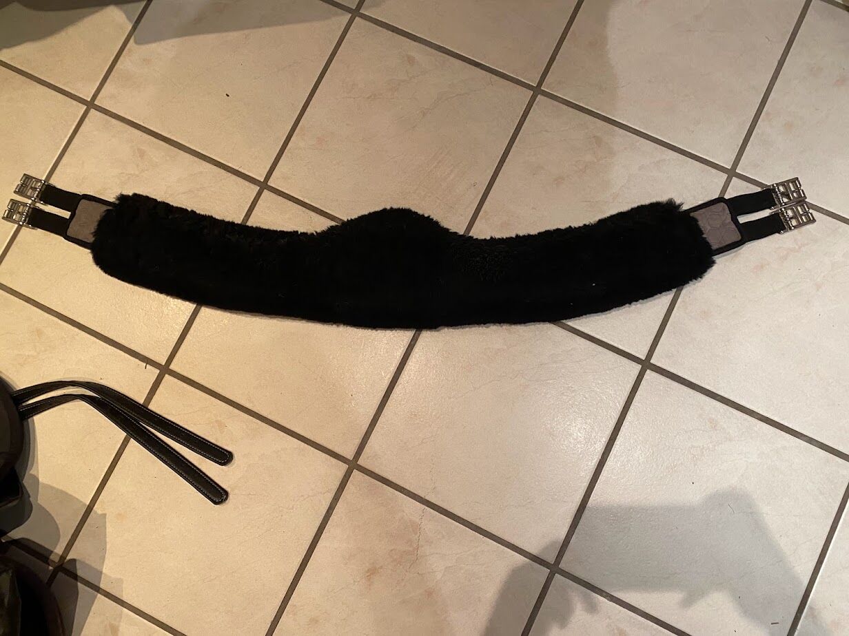 Wir verkaufen umständehalber unseren nur wenige Male benutzten Sattelgurt in 1,35m Länge. Hochwertiger, mondförmiger Langgurt aus Steppstoff mit abnehmbarem Lammfell. Die Polsterung aus Lammfell sorgt für Entlastung, verhindert ein Verrutschen und beugt Scheuerstellen sowie Hautirritationen vor. Die spezielle Form ist für runde Pferde mit kaum ausgeprägter Gurtlage. Mit selbstschließenden Rollenschnallen, beidseitigem Elastik und Ring für Hilfszügel. Pflege- und Produktinformationen und Spezialwaschmittel sind dabei. Neupreis ca. 170 €.