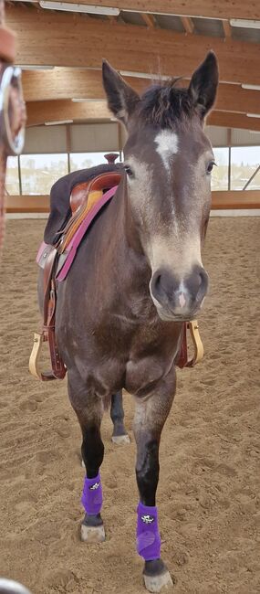Miss Sinny Bar - eine im Juni 2021 geborene buckskinfarbene Quarter Horse Stute mit einem Stockmaß von etwa 150 cm. Sie ist elegant, sportlich gebaut und gehört nicht zu den Gewichtsträgern, überzeugt aber durch ihre harmonische Entwicklung und ihre natürliche Athletik. Trotz eines angebrochenen Dornfortsatzes im Alter von zwei Jahren, der laut Tierarzt vollständig ausgeheilt ist, ist sie heute gesund, voll belastbar und wird regelmäßig geritten. Gerne kann der Tierarzt dazu befragt werden. Sie ist 5-Panel n/n über die Eltern, regelmäßig geimpft, entwurmt und zahnärztlich kontrolliert, läuft barhuf und war stets unter professioneller Sattelkontrolle. Aktuell lebt sie im Offenstall mit 24-Stunden-Heuversorgung und Weidegang und zeigt sich dort ranghoch innerhalb der Herde. Im Umgang ist sie ein sehr liebes, menschenbezogenes und verschmustes Pferd, das gleichzeitig willensstark, neugierig und manchmal etwas ungeduldig ist. Sie möchte immer gefallen, lernt schnell und zeigt viel Eifer sowie Offenheit für neue Aufgaben. Da sie noch viel hinterfragt und eine klare, faire Führung braucht, ist sie kein Anfängerpferd. Miss Sinny Bar wurde schonend und vielseitig nach dem Pro-Ride-Konzept ausgebildet. In der Halle läuft sie sicher in Schritt, Trab und Galopp und geht sowohl alleine als auch in der Gruppe zuverlässig ins Gelände. Besonders in der Freiarbeit sowie in der Boden- und Longenarbeit zeigt sie großes Talent. Durch ihre sehr gute Reining-Abstammung (Einsteins Revolution x Bueno Swiss Doc) ist sie nicht nur als Nachwuchspferd für ambitionierte Freizeitreiter interessant, sondern perspektivisch auch für die Zucht. Der passende Sattel kann auf Wunsch mit erworben werden. Da es sich um keinen Notverkauf handelt, wird großer Wert auf ein geeignetes Zuhause gelegt, in dem diese talentierte Stute weiter gefördert und abwechslungsreich beschäftigt wird. Miss Sinny Bar bringt alles mit, was man sich von einem jungen, motivierten Pferd wünscht, das gemeinsam mit seinem Menschen wachsen möchte.