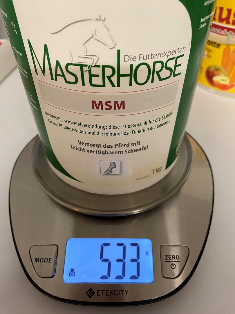 1.533 Gramm insgesamt. Der Natusatbeutel ist neu und ungeöffnet, die 533 Gramm in der Master Horse Dose sind auch von Natusat (Gewichtsangabe auf Bild ist ohne Dose). Dosierlöffel wird mitgeliefert.