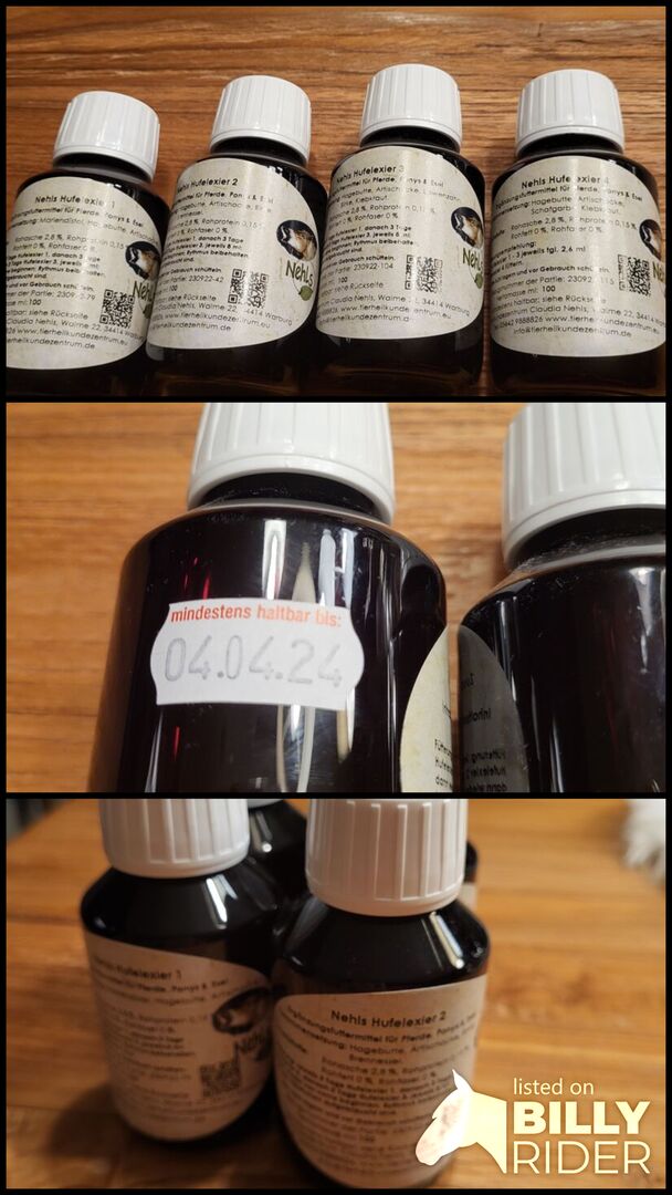 Ich verkaufe ein Set Hufelixier,  ungeöffnet, MHD 4/24, 400 ml. Ergänzungsfuttermittel zur Unterstützung des Hufwachstums, insbesondere bei Hufrehe,  reicht für ca 37 Tage. NP 99,50 €, VB 40 € zzgl. Versand