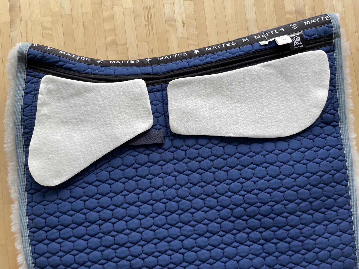 Dressurschabracke von Mattes mit Echtlammfell auf der kompletten Innenseite - wärmeregulierend & super weich. Das Korrektursystem funktioniert über vier Kammern an der Rückenpartie, die mit den beiliegenden Filzpolstern individuell bestückt werden können und so optimalen Druckausgleich ermöglichen. Weitere Infos des Herstellers und genaue Konfiguration sind den Bildern zu entnehmen.
