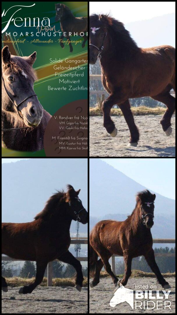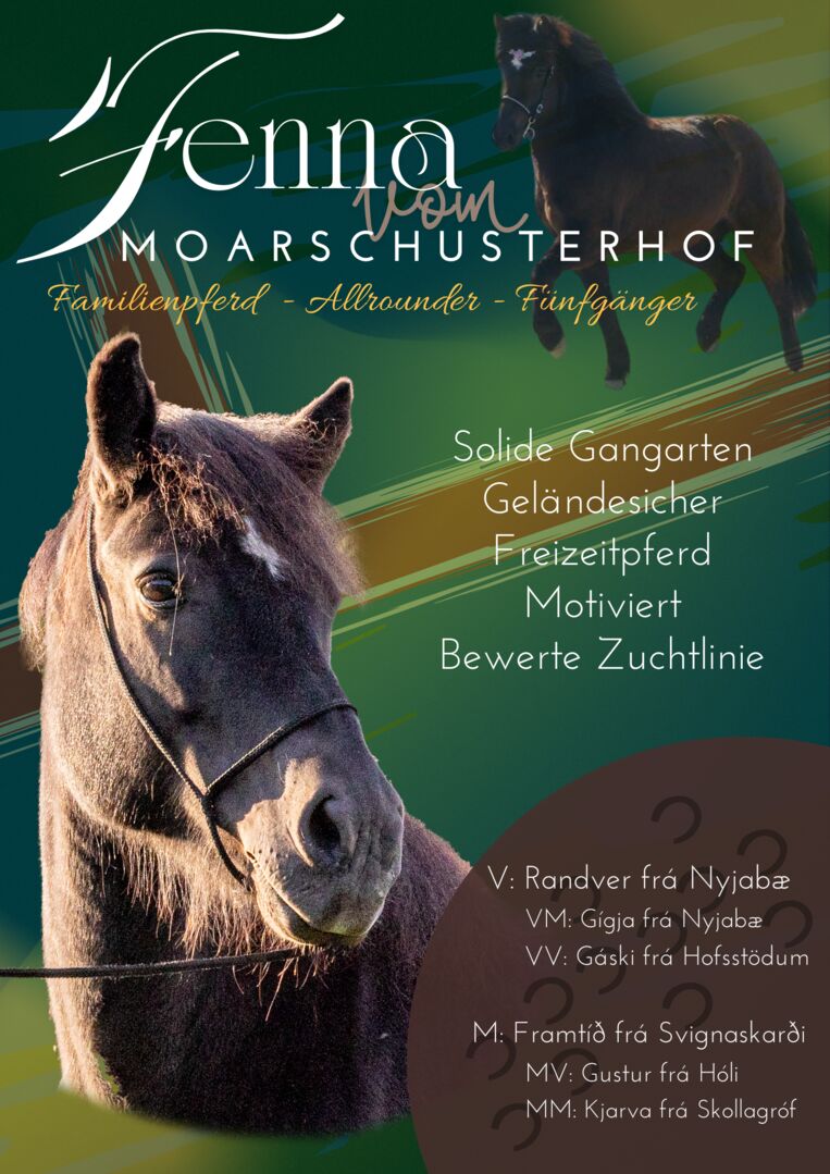 Fenna hat gute solide Grundgangarten, unter anderem einen aussergewöhnlicher Schritt, guten taktklaren Trab, für einen Fünfgänger einen guten Galopp und auch im Viereck macht sie eine gute Figur. Ihr Tölt ist etwas passverschoben, aber mit gutem und richtigem Training ist sie leicht im Tölt zu reiten, ihre Wahlgangart unter dem Reiter ist meist der Tölt. Ihr Pass ist leicht abrufbar, braucht noch etwas Tempo aber sie hat dort ein sehr gutes Potential und er macht irre viel spass !