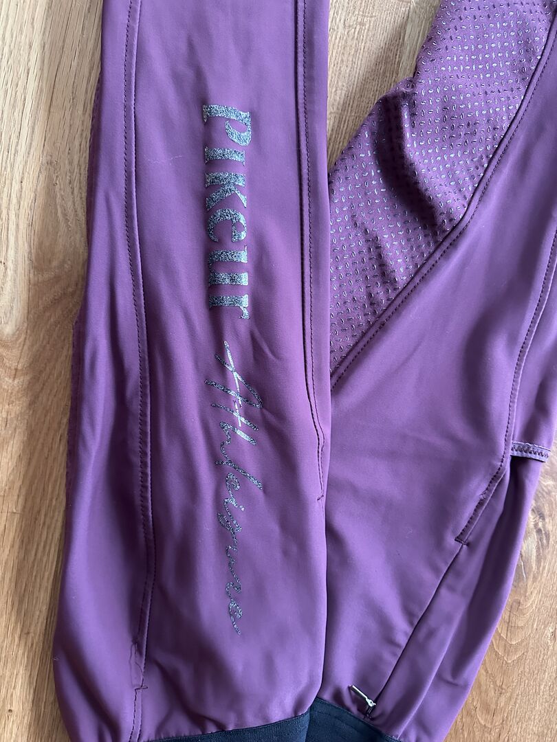 Diese sportliche Damenreitleggins Gia Grip Athleisure von Pikeur beeindruckt mit einem außergewöhnlichen Tragekomfort. Sie ist aus einer Funktionsware gefertigt, welche eventuell entstehen Schweiß ideal absorbieren kann. Sie ist super elastisch und bietet eine optimale Passform. Der Grip der Reithose sorgt für einen sicheren Halt und Haftbarkeit im Sattel. Die weiche Innenseite der Reitleggings, sowie der neuartige breite elastische Form Bund ohne Knopfverschluss, sorgen für ein angenehmes Tragegefühl. Der Beinabschluss ist aus einem elastischen Oberstoff gefertigt. Die High Waist Taillierung ist besonders angenehm beim Sitzen und der sportive Nahtverlauf sorgt für ein schickes Design mit einem Kontrast Glitzer Streifen am Elastik Bund. Die seitliche Handy Einschubtasche am rechten Oberschenkel ist funktional und praktisch. Am linken Oberschenkel seitlich ist ein Pikeur Glitter Print angebracht.