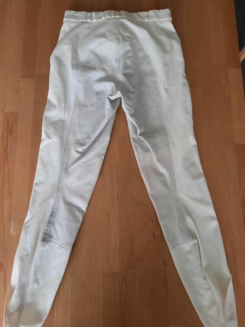 Wenig genutzte weiße Turnierreithose der Marke Pikeur mit Vollbesatz in Größe 38. Die Hose hat an der Seite einen schwarzen Streifen. Klettverschlüsse sind alle in Ordnung. Material: 64% Baumwolle, 29% Polyamid,7%Elasthan Leichte schwarze Verfärbung unten hinten links am Besatz. Siehe Foto Dazu passend eine weiße, dicke Dressur Schabracke mit schwarzen Streifen am Rand. Leichte Gebrauchsspuren. Sehr schöner passender Dress für Ross und Reiter