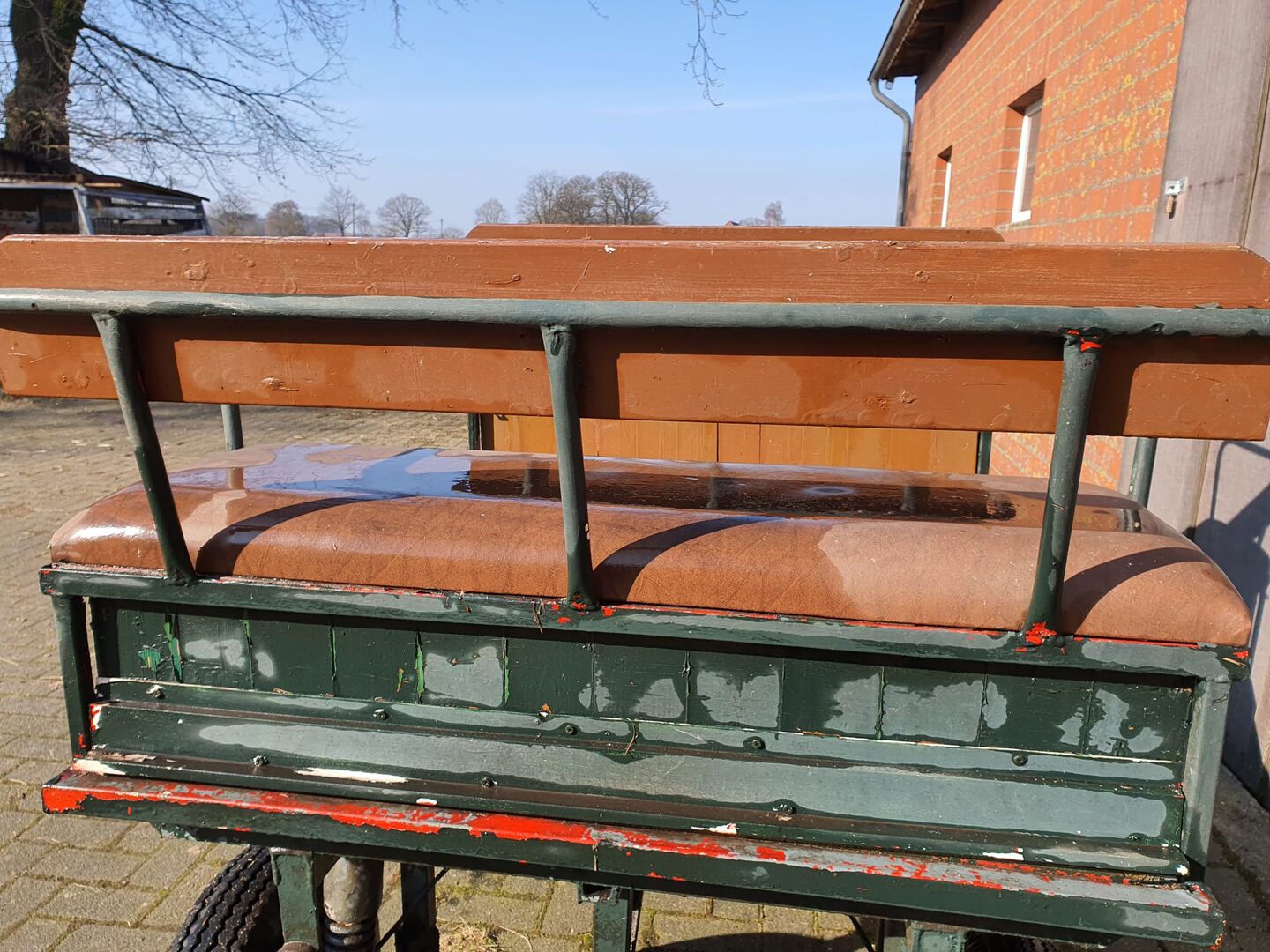 Sehr stabile kleine Kutsche gebremst. Für Ponys ab 1 m stm bis 135 stm . Ein spännig und 2 Spännig zu fahren . Ist leicht zu schieben. Sitzpolster alle okay. Könnte etwas Farbe vertragen und nen neuen Teppich. Sonst alles top. Passt sehr leicht in einen pferdeanhänger. Geben Sie nur ab da wir uns eine Maraton Kutsche gekauft haben.