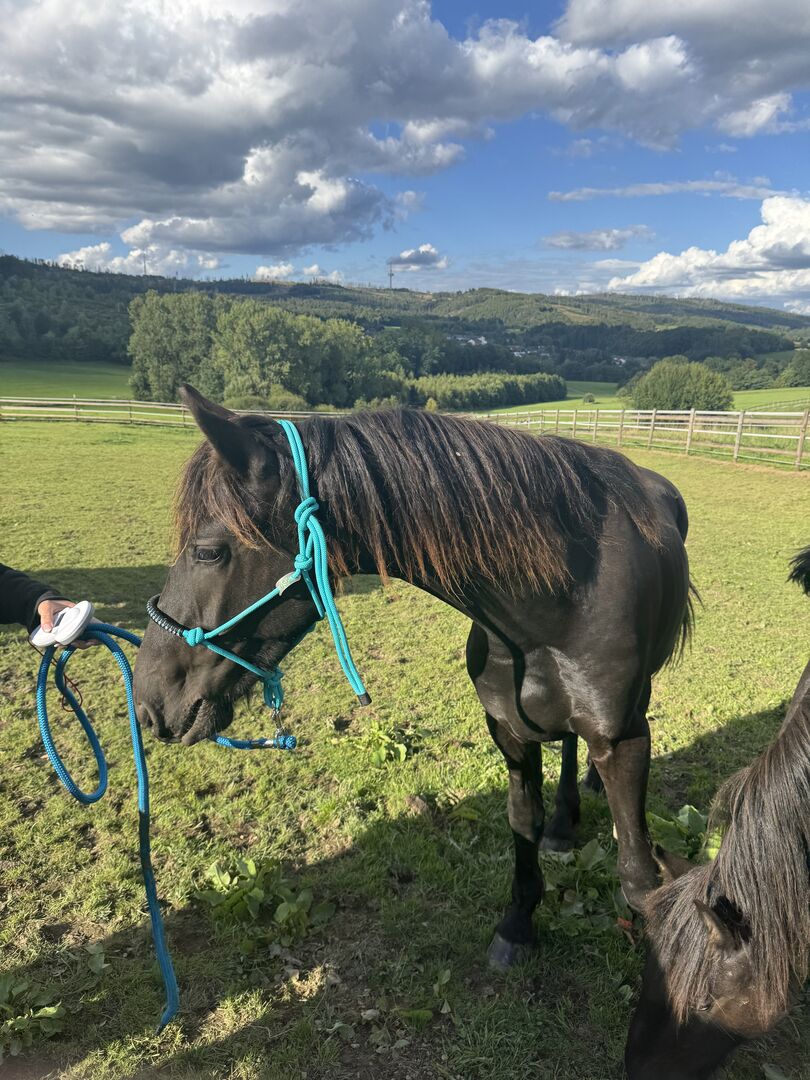 Er ist regelmäßig entwurmt, altersentsprechend geimpft und vom Tierarzt gesund erklärt (Zähne, Hufe und Hoden, alles wie es sein soll). Halfter anziehen ist absolut unproblematisch, er liebt es geputzt/gekuschelt zu werden, macht viel Unsinn mit (wie Sachen auf ihn ablegen), Hufe geben funktioniert und er kennt Katzen, Hunde sowie Kinder.