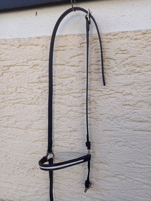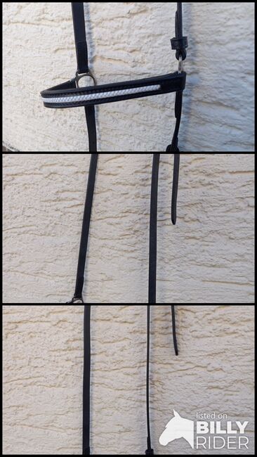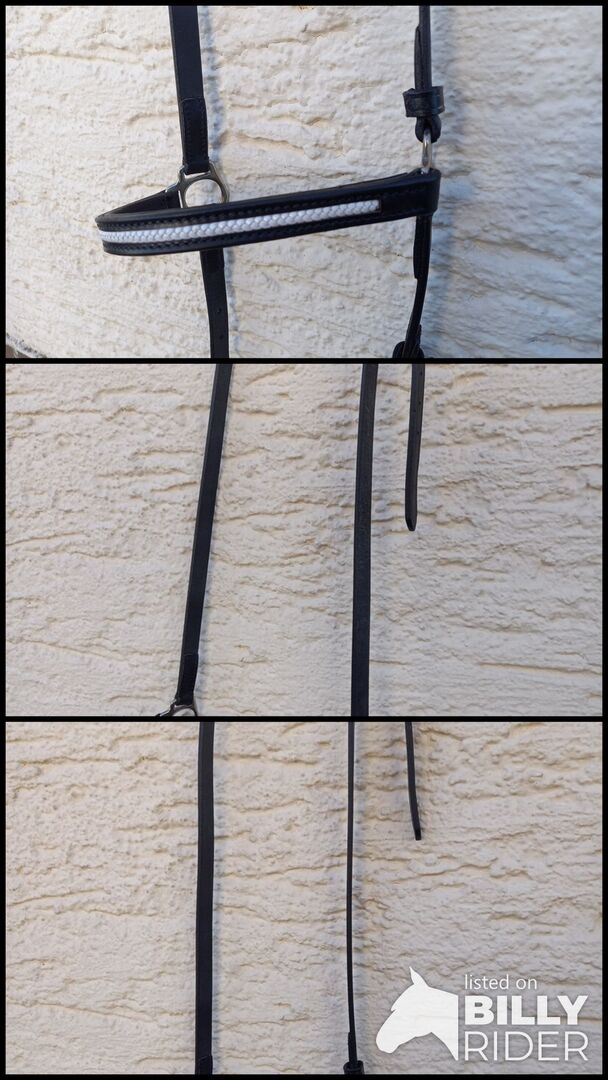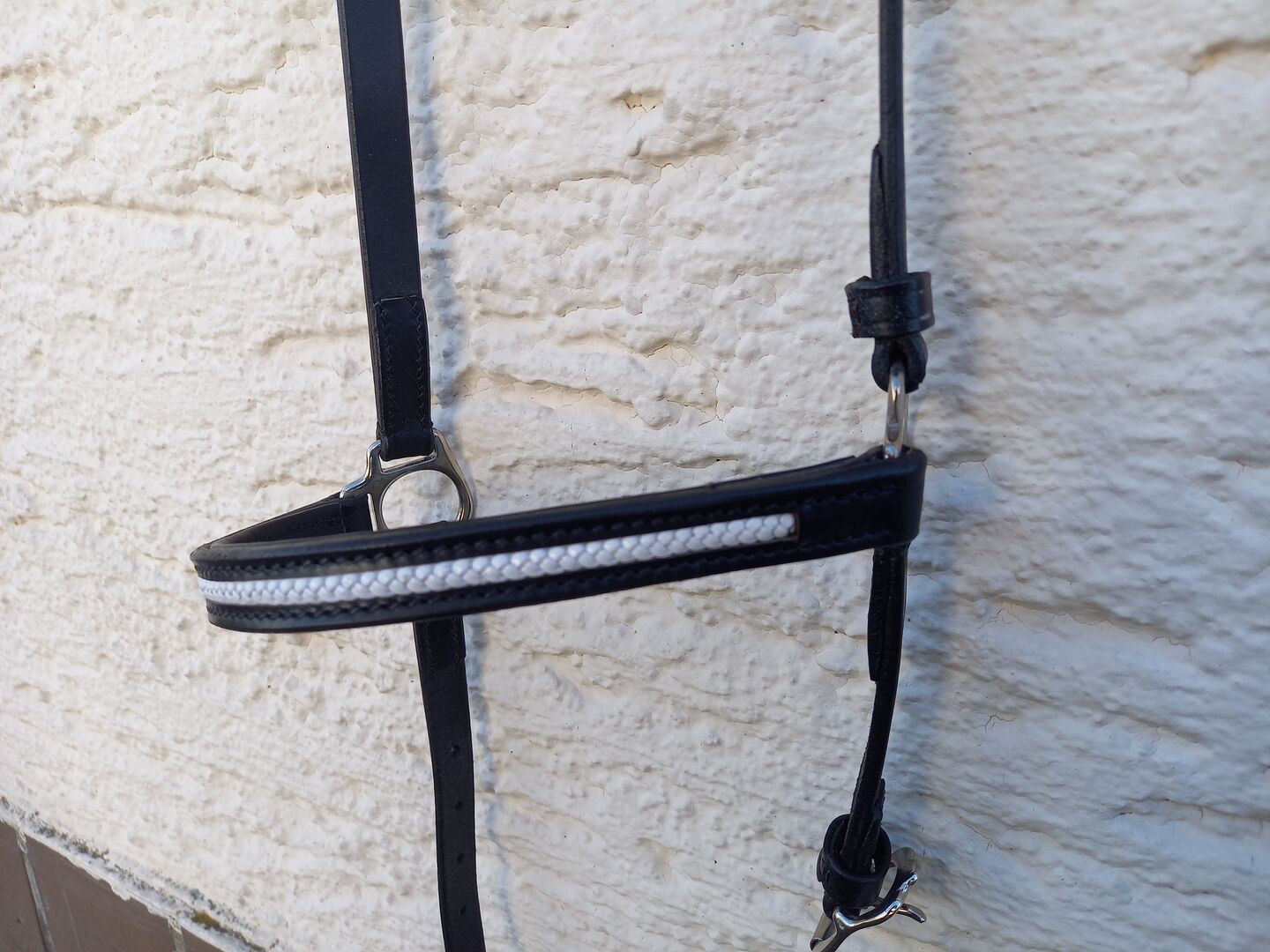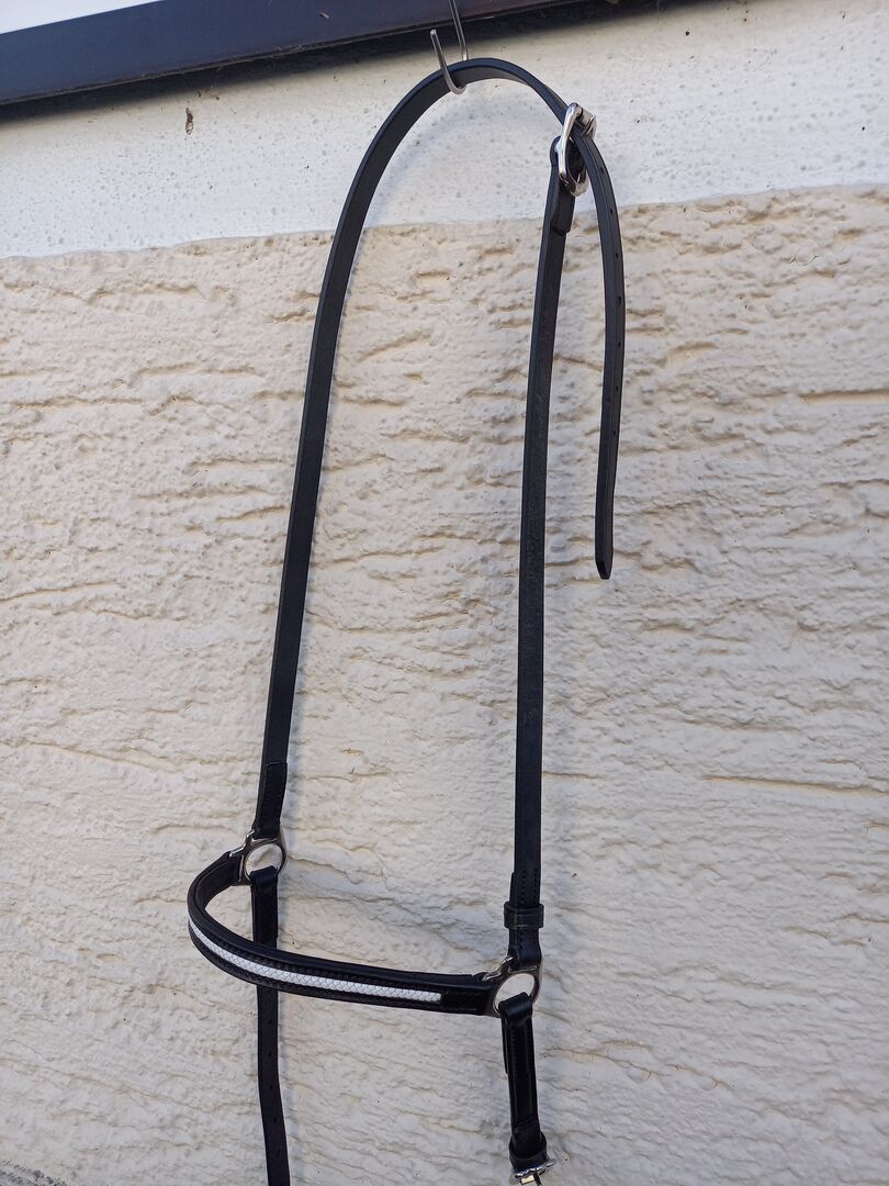 Reithalfter (für Islandpferde), unbenutzt, aus schwarzem Leder mit silberfarbigen Beschlägen und weiß geflochtenem Nasenriemen
