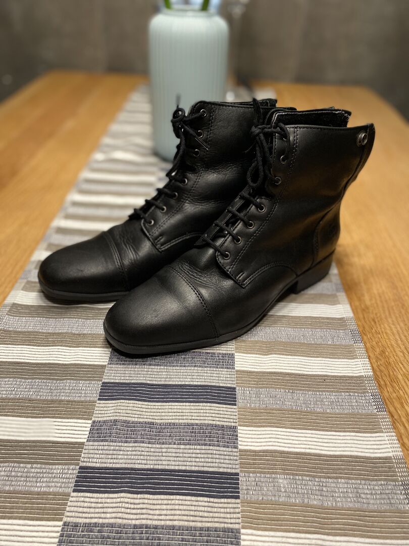 Die modisch, schlanke Schnürstiefelette von 4RIDERS ist aus echtem Rindleder mit einer rutschfesten Gummisohle gefertigt.