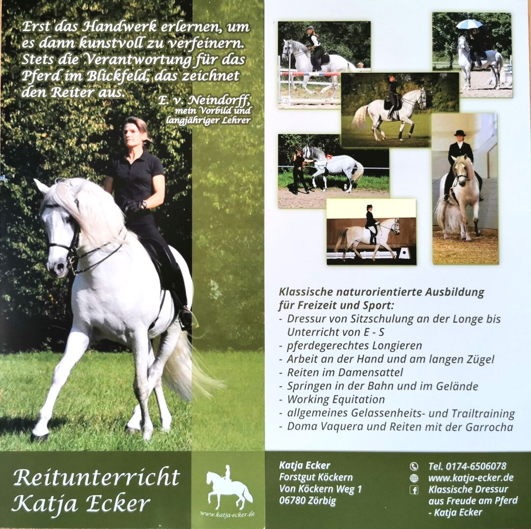 Reiter- und Pferdeausbildung nach reellen klassischen Grundsätzen (bin langjährige E.v.Neindorff-Schülerin) immer im Sinne des Pferdes