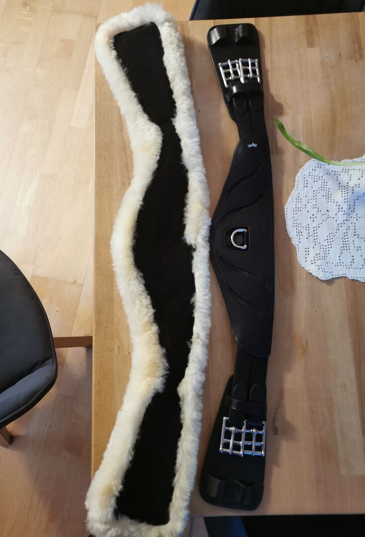 Kurzgurt aus Leder mit Klettsystem (passendes Lammfellpad enthalten) Größe: 70cm Neupreis Gurt: 100€ Neupreis Lammfellpolster: 100€ lag 1x zum Probieren am Pferd