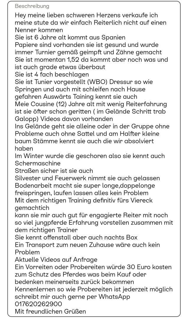 Ein Vorreiten oder Probereiten würde 30 Euro kosten zum Schutz des Pferdes was beim Kauf oder bedenken meinerseits zurück bekommen