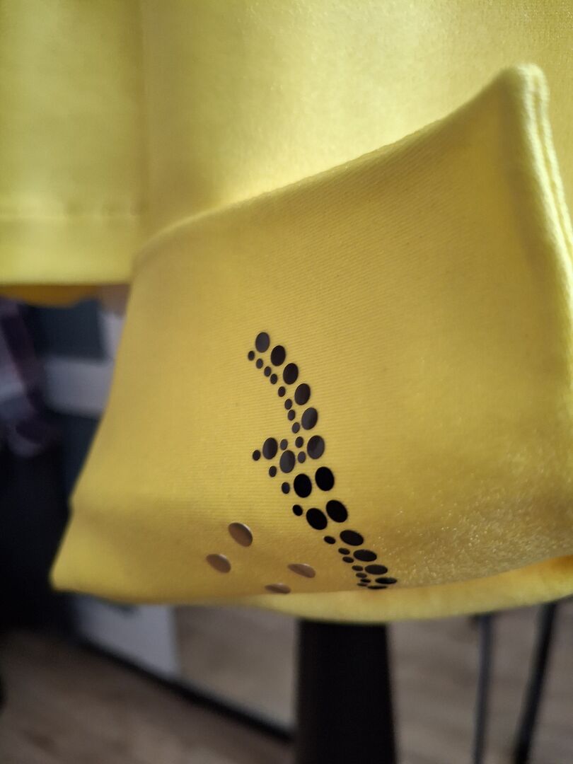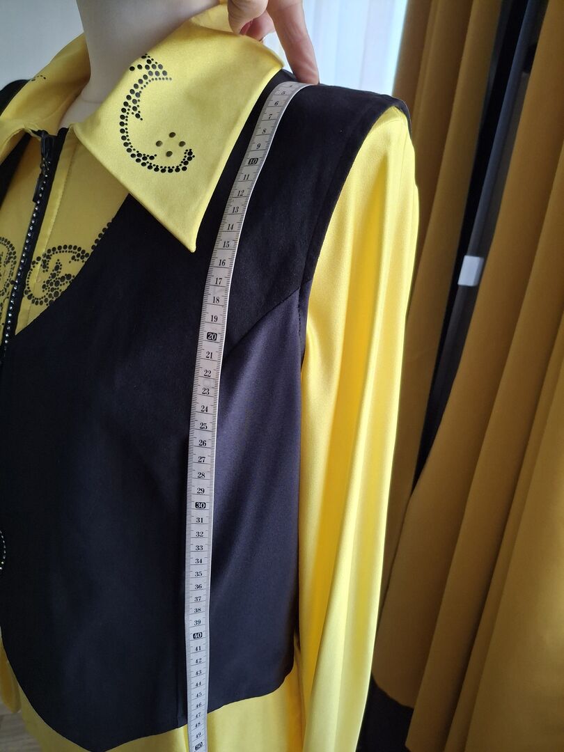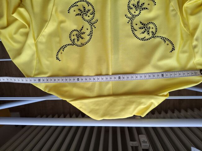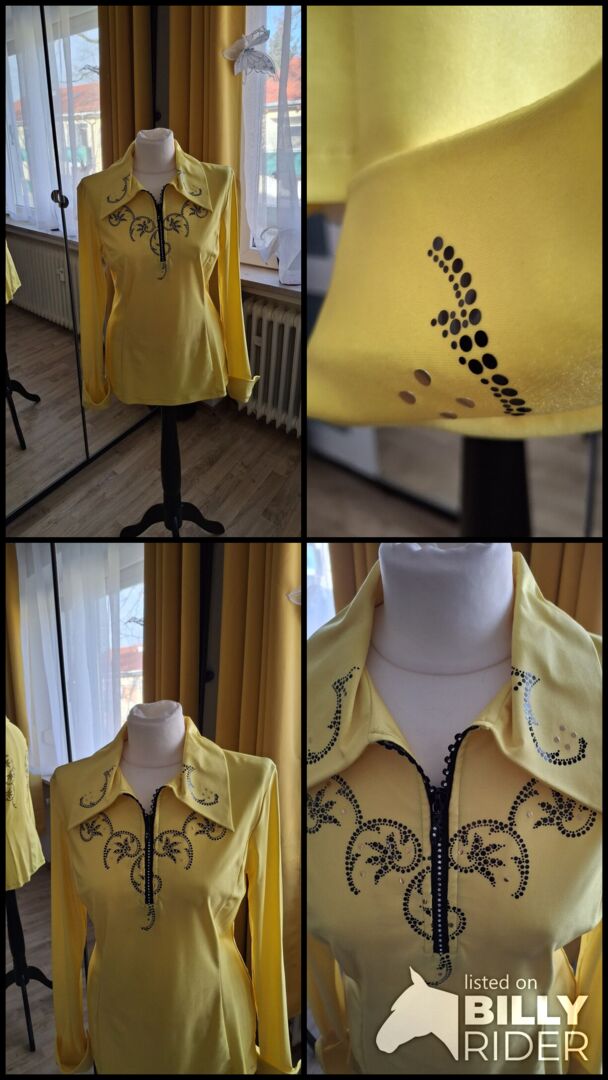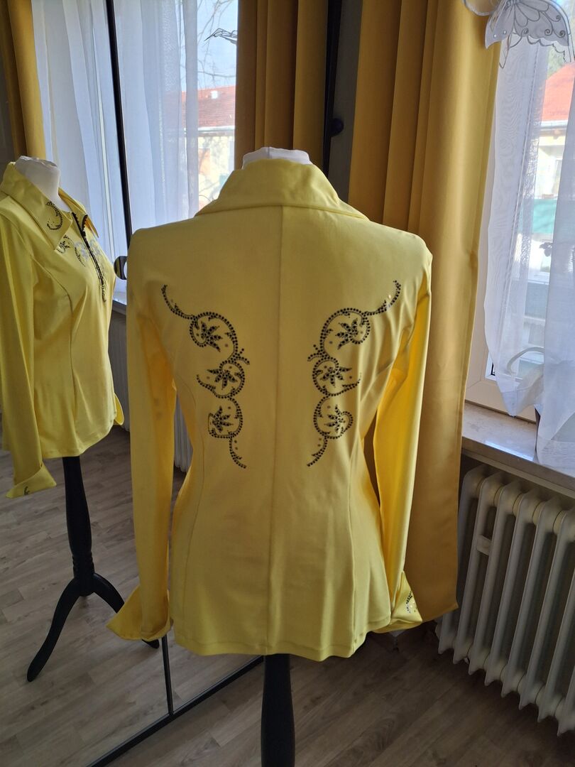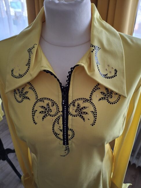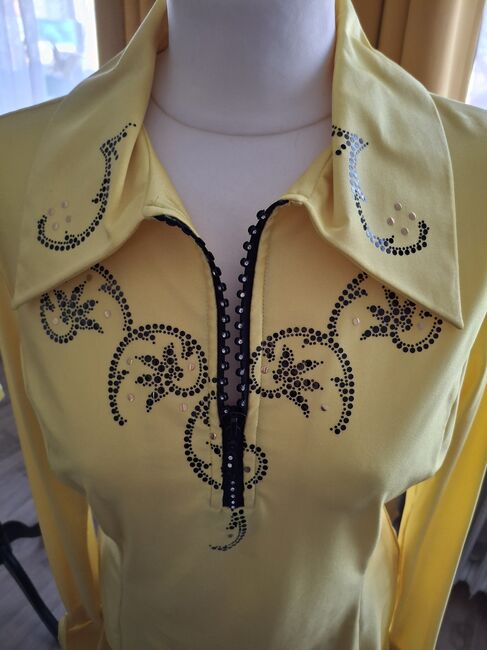 Biete ein wunderschönes Oberteil aus Stretchmaterial in der Farbe gelb mit schwarzen Apliktionen an. Ideal für die Show oder andere Auftritte, Gr. L, dehnbar. Reißverschluss mit Swarowski Steinen. Maße siehe Bilder.