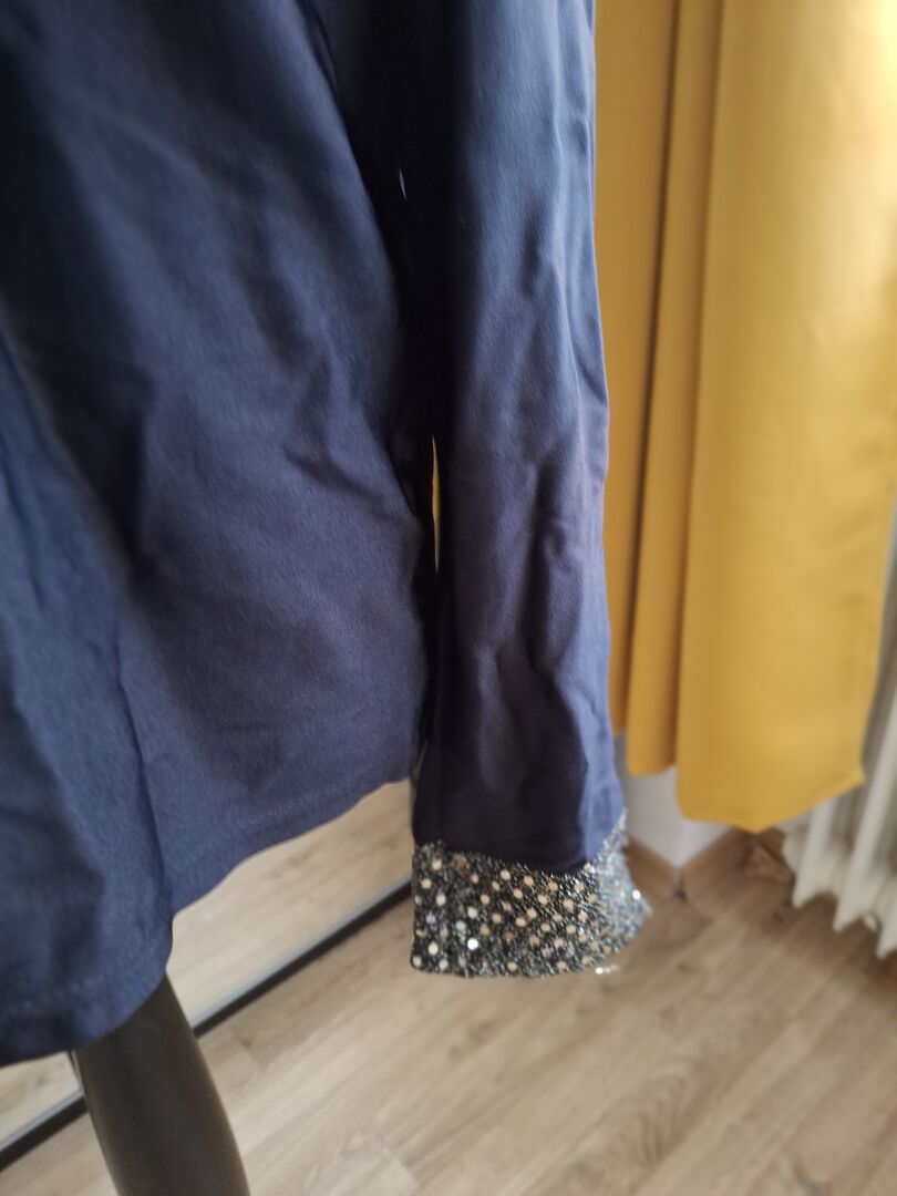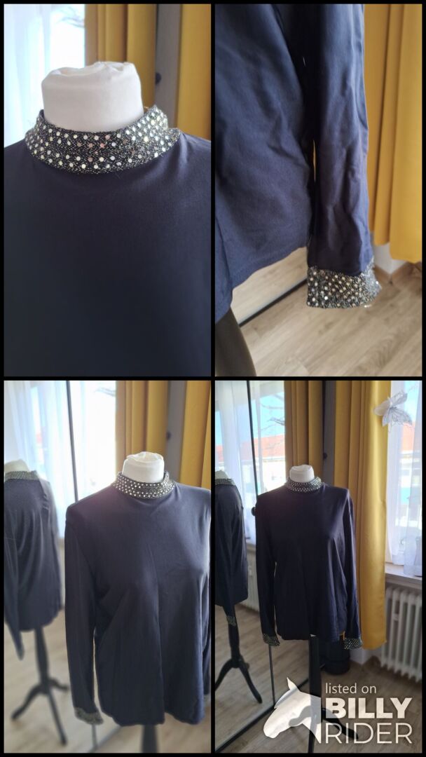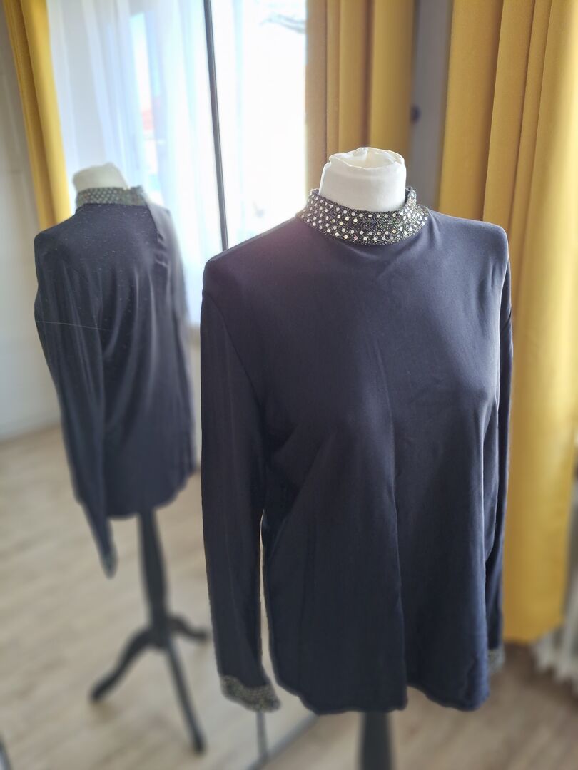 Schwarzes Shirt, der Stehkragen und die Manschetten sind mit Pajetten verziert. Lt Schild Gr XXL, würde eher L sagen. Hervorragend für shows und Auftritte geeignet oder als absoluter Hingucker.