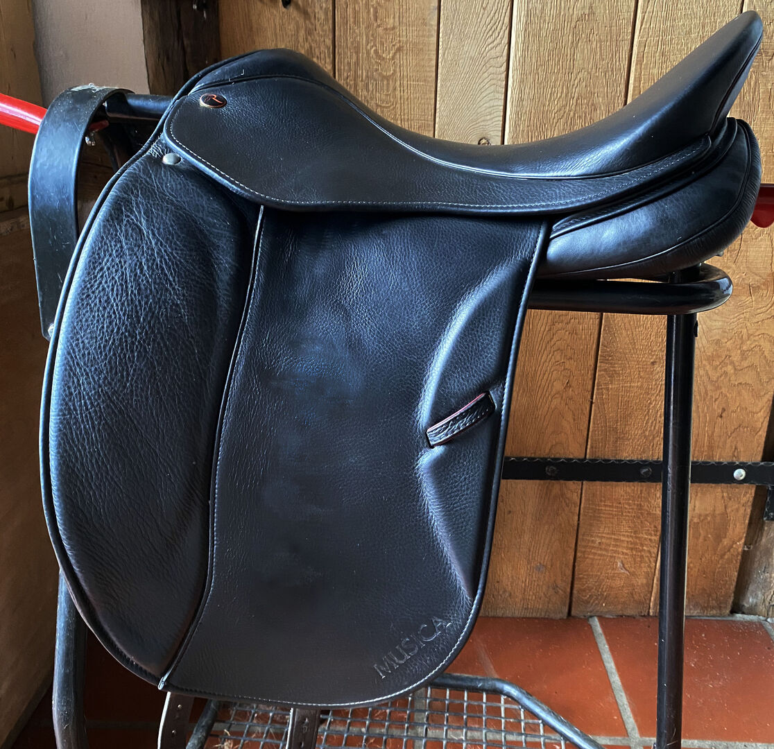 Dressursattel-Musica Classic mit halb-tiefem Sitz, 18“. Der Musica überzeugt durch seine in bestem Rindleder doublierten Sattelblätter und der Knielage mit untenliegender Pausche. Vollflexibler Kunststoffbaum mit Kopfeisen, bestes ausgewähltes Rindleder sowie ein Sattel, der jederzeit an die Anforderungen des Pferdes angepasst werden kann.