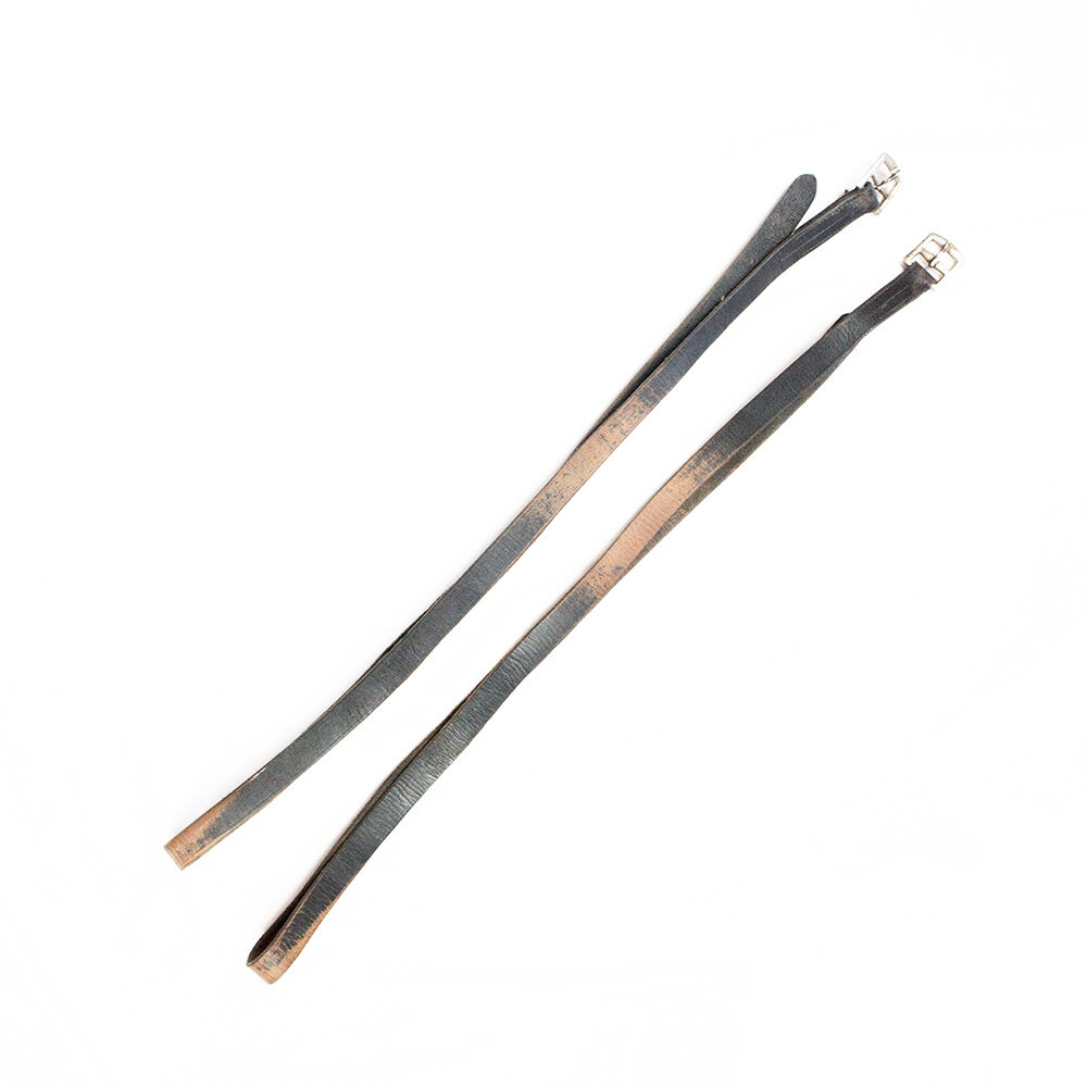 Die Steigbügelriemen in schwarz sind die perfekten Riemen für jeden schwarzen Sattel. Die praktischen Bügelriemen bieten optimalen Halt und sind 165cm lang. Sie sind aus Leder. Die Steigbügelriemen haben starke Gebrauchsspuren wie Abnutzungen, Verfärbungen und Rost.