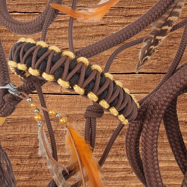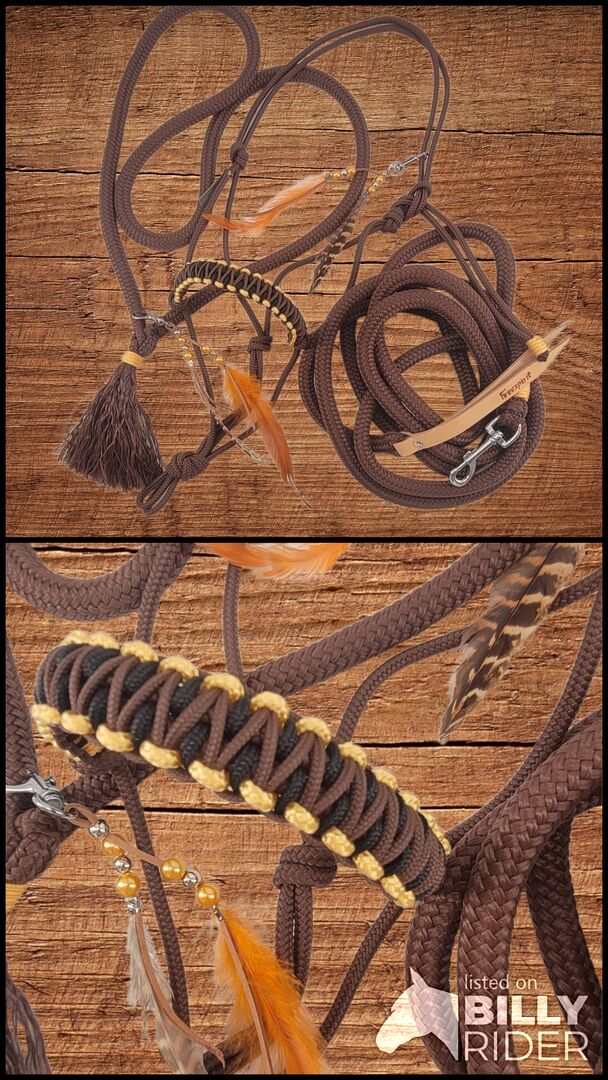 Set Chic in Braun, Gold, Schwarz Grösse Pony Set bestehens aus Knotenhalfter in braun mit geknoteter Nase in 3 Farben. Mit Braun, Gold und Schwarz. Zusätzlich ein Halsstrick in der gleichen Farbe mit Federclip und ein Bodenarbeitsseil 3.7 m. Knotenhalfter 6 mm dick, Bodenarbeitsseil und Halsstrick 12 mm breit