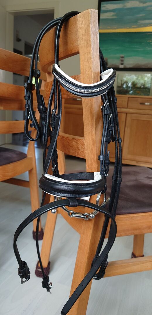 Weiß unterlegt, also schön weich. Mit Glitzerstirnriemen, Zügeln und doppelt gebrochener Schenkeltrense, 11 cm.