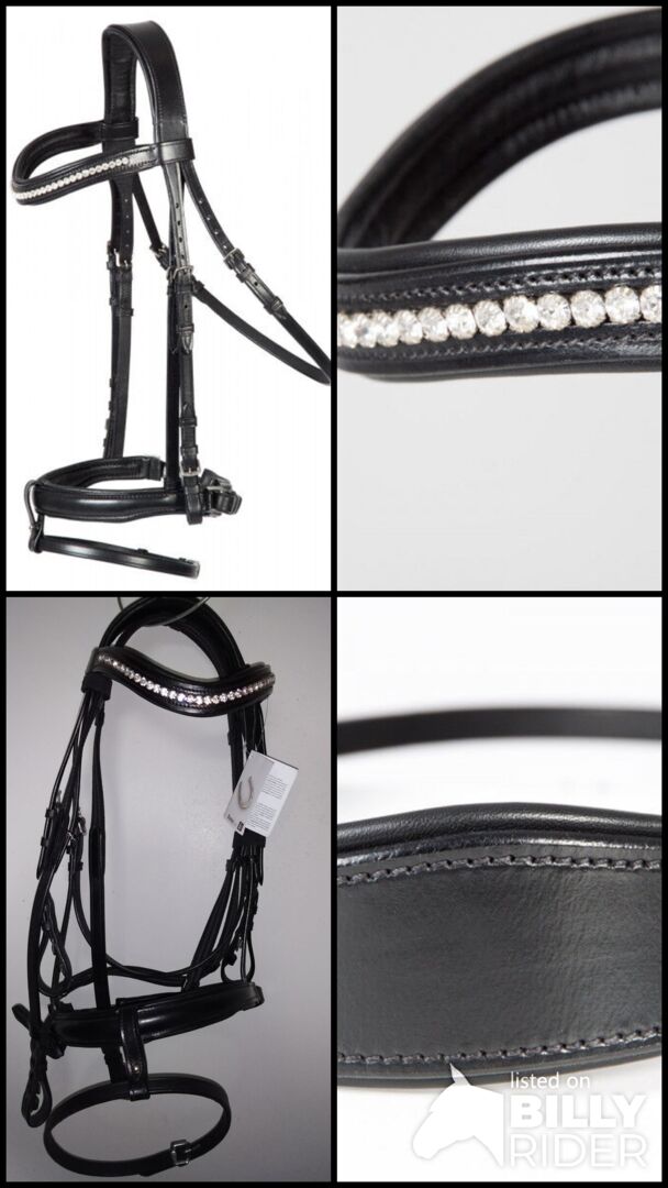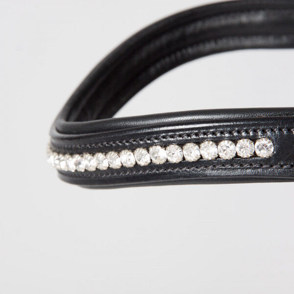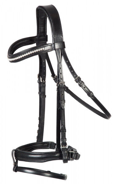 Vielseitig einsetzbarer Trensenzaum aus handgearbeitetem Leder. Durch die Sperrriemen-Schlaufe, die sich bei diesem Zaum unsichtbar abnehmen lässt, erhält man hier wahlweise ein einfaches schwedisches oder ein kombiniertes Reithalfter. So ist diese Trense auch ideal für den variablen Einsatz als Trainingstrense oder (Spring-) Turniere geeignet. Das breite Genickstück mit anatomischem Ohrenausschnitt ist besonders weich unterlegt und verteilt so den eventuell entstehenden Druck optimal. Als kleines optisches Highlight verfügt dieser Zaum über einen weich unterlegten, leicht geschwungenen Stirnriemen mit eingefassten Strasssteinen. Alle höhenverstellbaren Bestandteile (Nasenriemen, Kehlriemen und Backenstücke) lassen sich beidseitig anpassen. Geliefert wird sie mit passenden Gurtzügeln inkl. Martingalstoppern.
