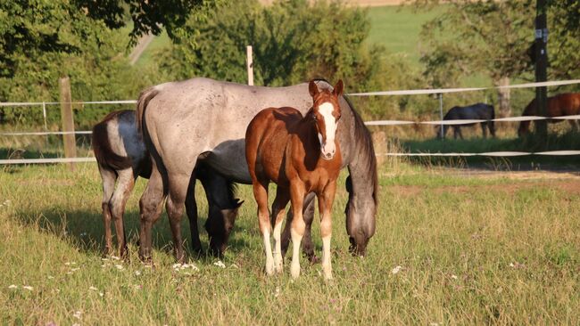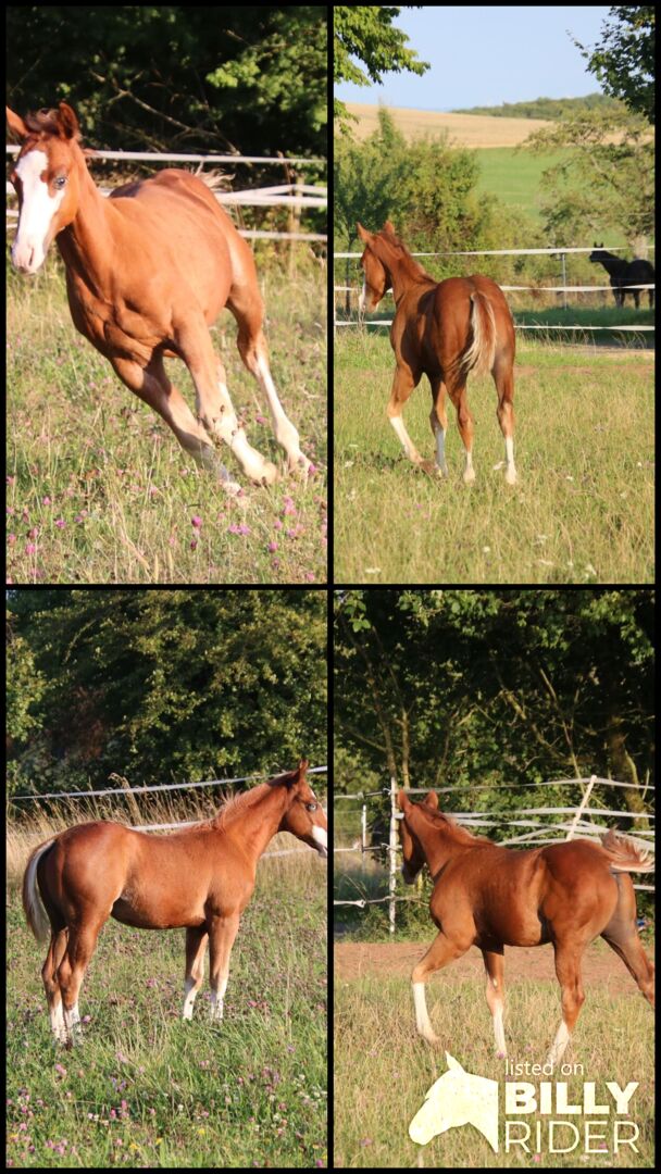 BE Diamonds Gunshine - dieser Eyecatcher, 4.25 geboren mit einem geschätzten Endmaß von 148 -153 cm, beeindruckt nicht nur mit seiner tollen Zeichnung, sondern auch mit seinem Charakter, seinem Körperbau und seiner Abstammung. Grays Starlight, Shining Spark, Peppy San Badger und Lil Ruf Peppy, diese erfolgreichen QH Hengste der Reining Zucht findet man in seinem Papier. Diamonds Vater, Walla Walla Gunshine, wurde sehr erfolgreich geshowt (LTE: 20.000 $). Der Jährling besitzt einen verschmusten, coolen Charakter. Ist sportlich unterwegs und weiß sich zu bewegen. Der Hengst ist harmonisch gebaut mit ausgewogener Bemuskelung und korrektem Körperbau. Er hat ein blaues und ein braunes Auge. Diamond wächst artgerecht mit gleichaltrigen Jungpferden auf und kennt das Fohlen ABC. Top Nachwuchspferd mit einem Charakter aus Gold.