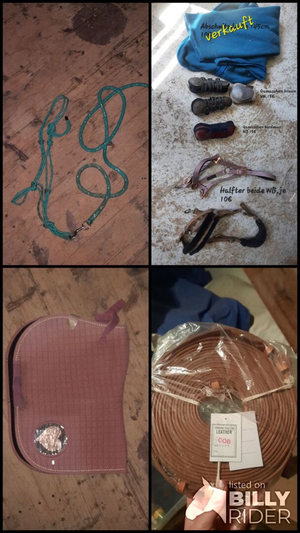 Verkaufe einige meiner Sachen Halfter Größe Full ,je 10 € Lederfahrleine Cob 25 € Fliegenmaske Cob, kleines Loch am Augennetz 5€ Lila Schabracke Dressur Full und Eskadron VS Full ,je 10€ Rosa mit Herz, gibt es eine passende Fliegenhaube dazu 15€ Kann abgeholt werden, bei Übernahme der Versandkosten kann alles auch versandt werden